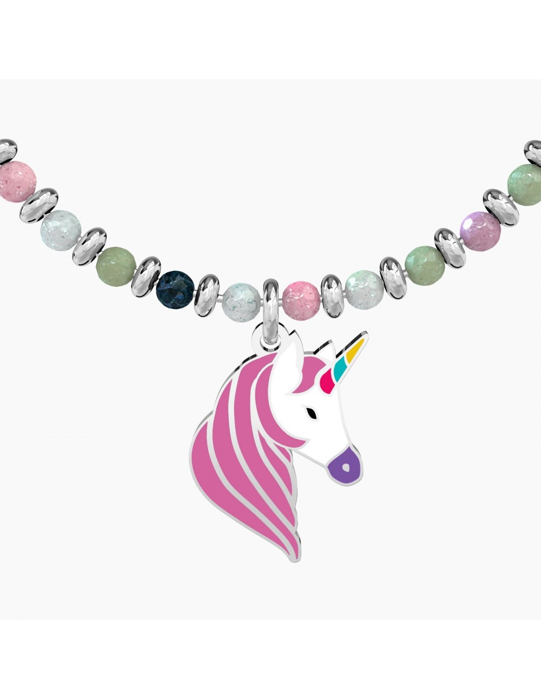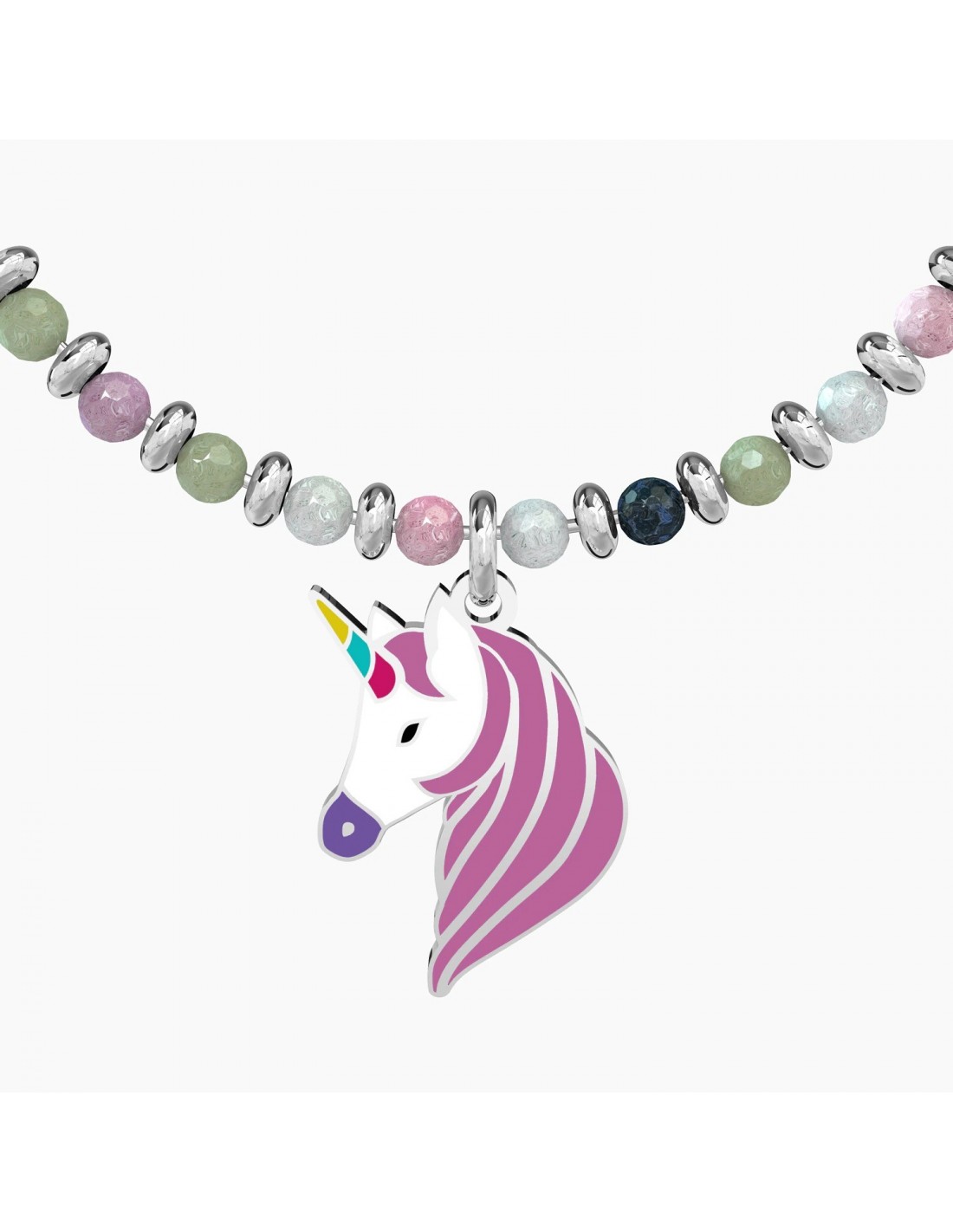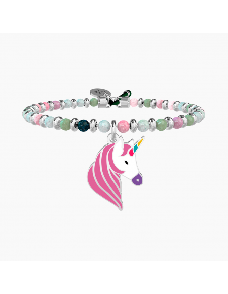 Continua a sognare, insegui i tuoi desideri e come per magia spiccherai il volo attraverso tutti i colori dell'arcobaleno. Bangle con filo armonico in acciaio, sfere in agata multicolor e ciondolo a forma di unicorno smaltato.
