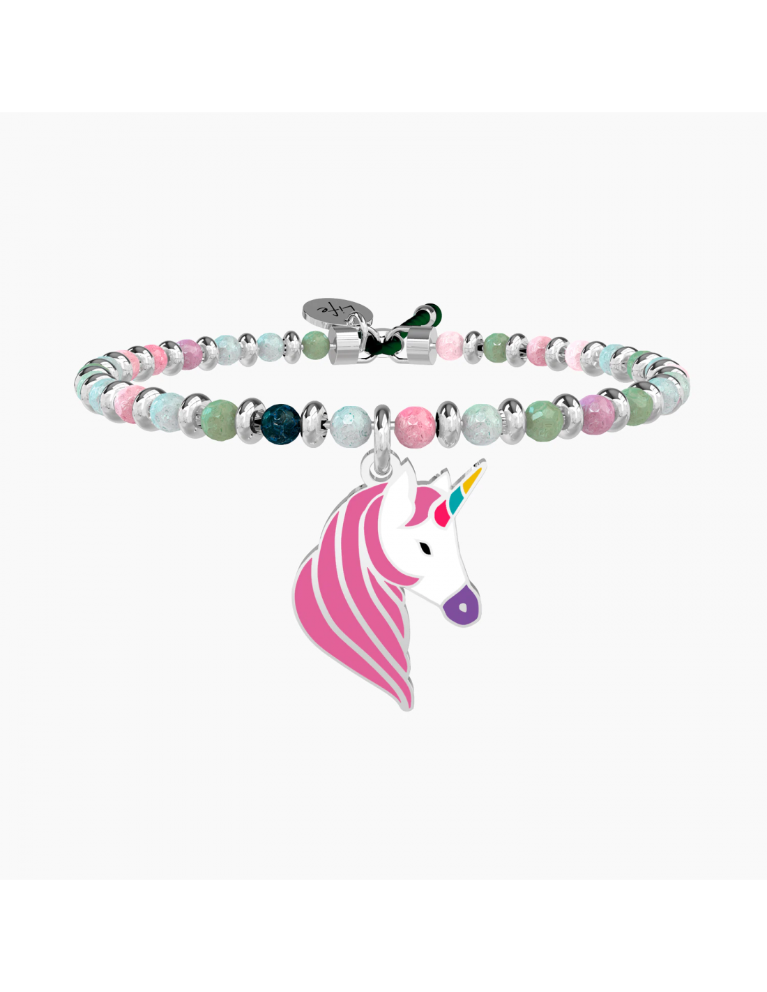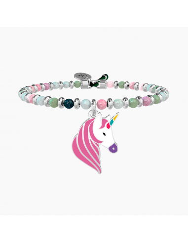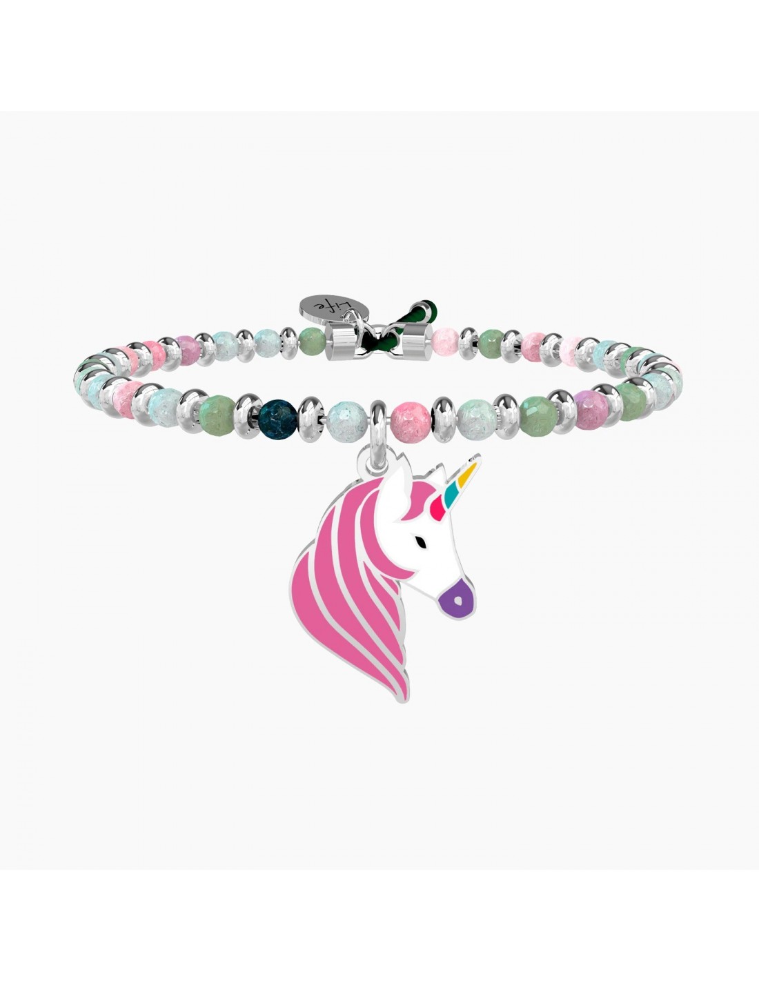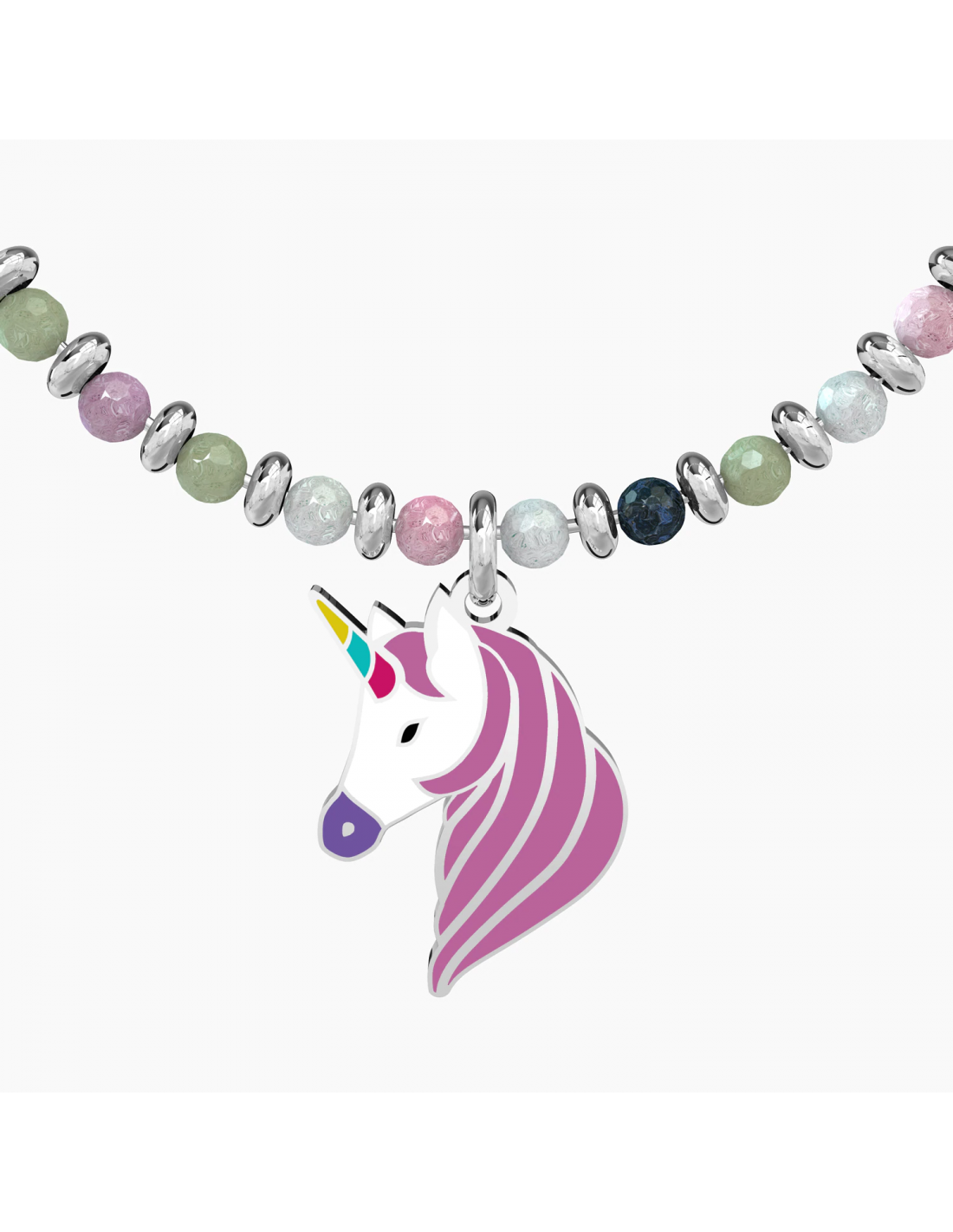 Continua a sognare, insegui i tuoi desideri e come per magia spiccherai il volo attraverso tutti i colori dell'arcobaleno. Bangle con filo armonico in acciaio, sfere in agata multicolor e ciondolo a forma di unicorno smaltato.