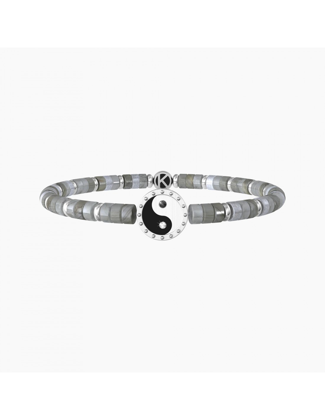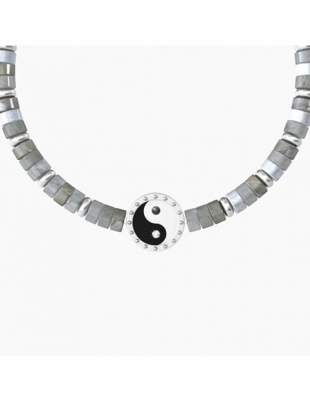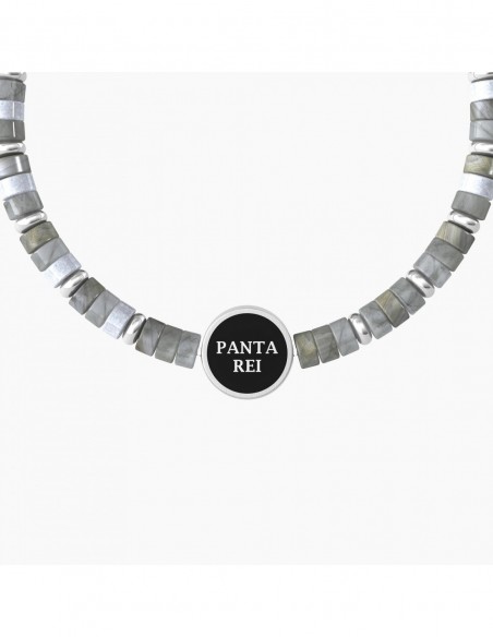 Bracciale elastico con cilindri in agata grigia alternati ad anelli in acciaio e piastra tonda con rifinitura borchiata e cristalli e retro nero.
