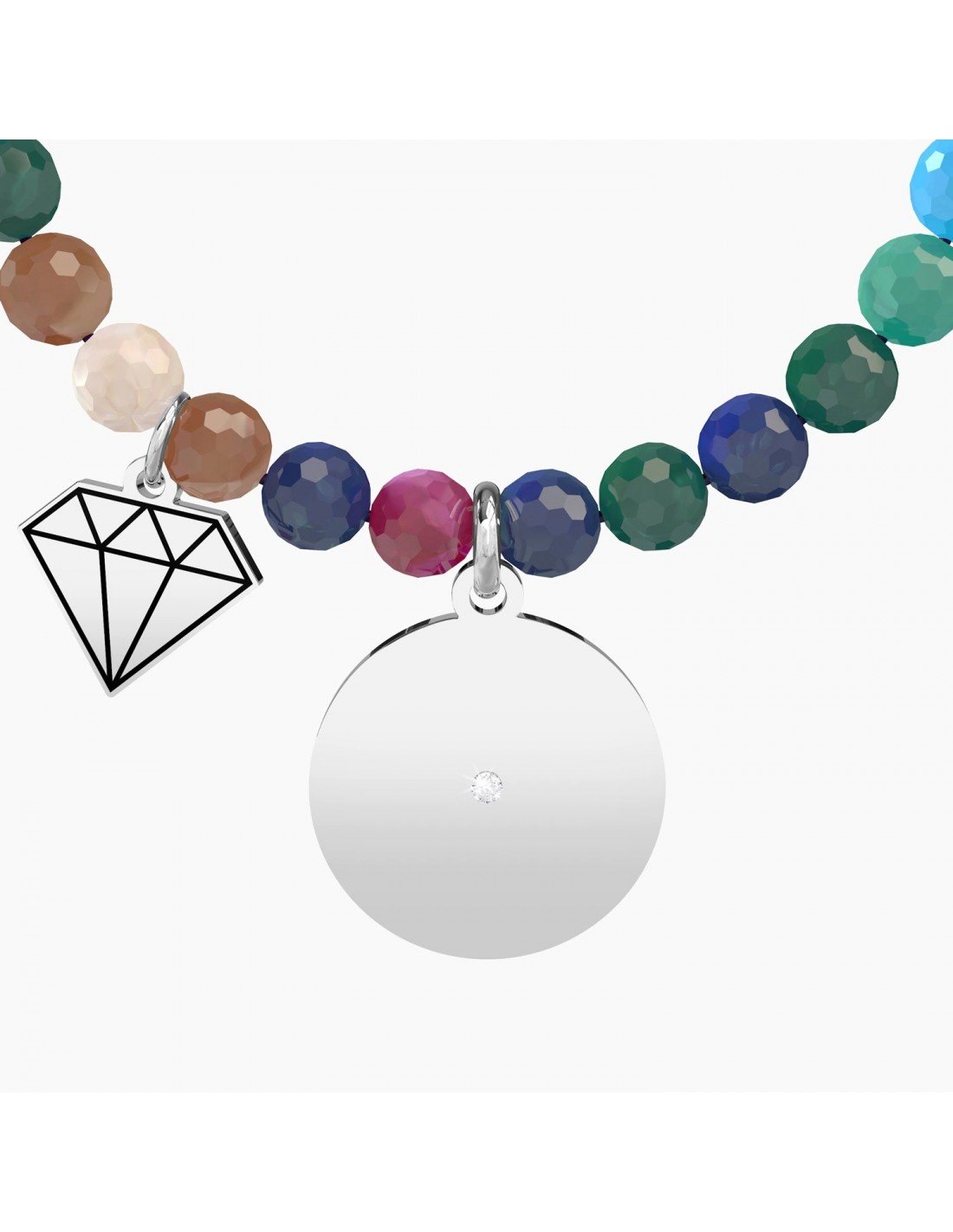 Bracciale elastico con sfere sfaccettate in agata multicolor e ciondoli in acciaio tondo e a forma di diamante.