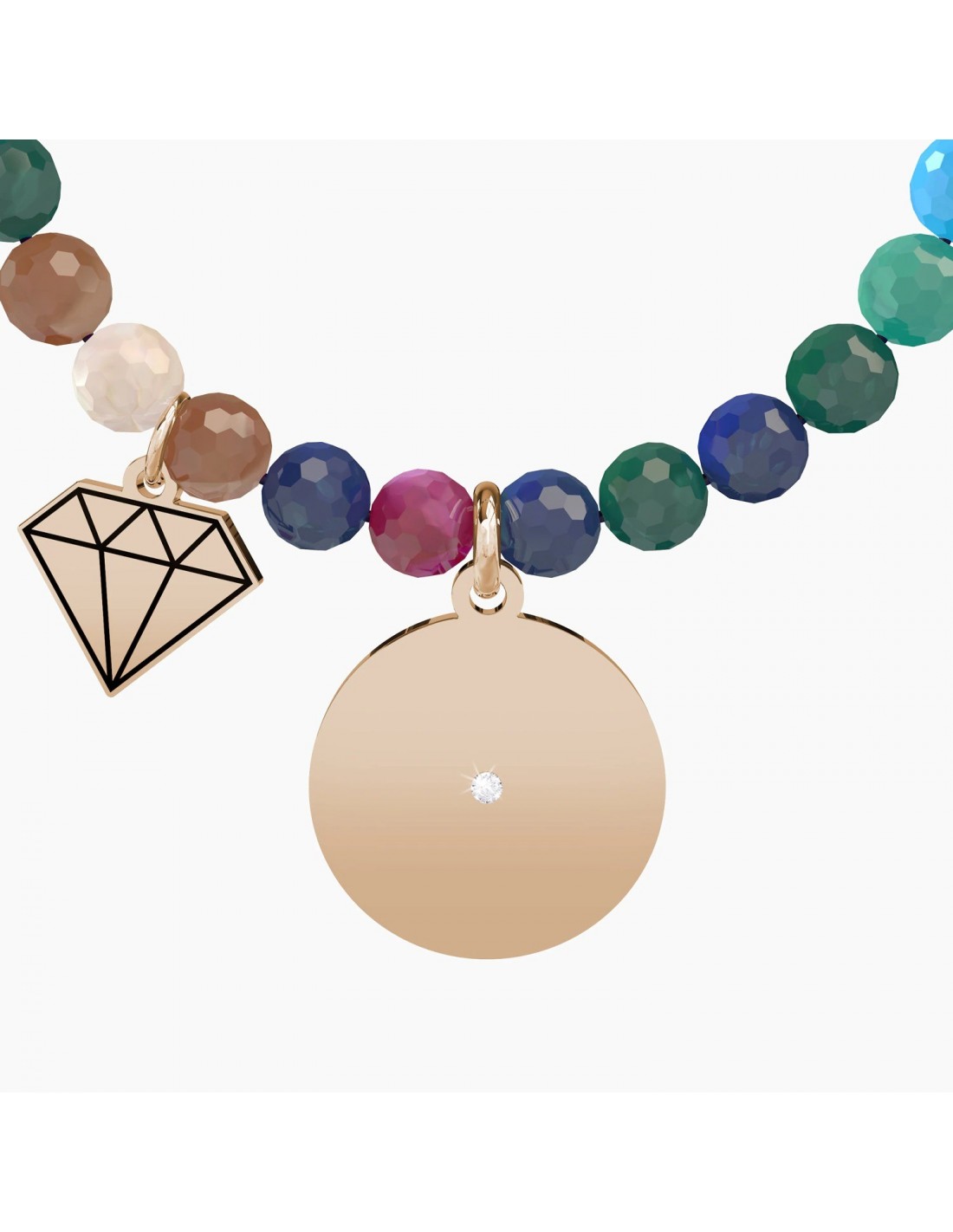Bracciale elastico con sfere sfaccettate in agata multicolor e ciondoli in acciaio color oro rosa tondo e a forma di diamante.