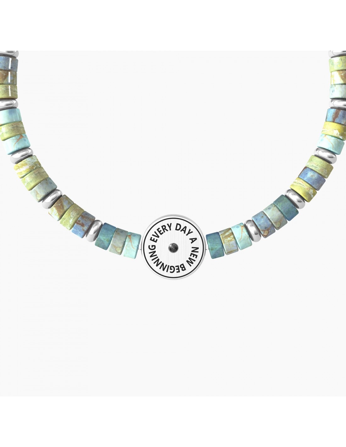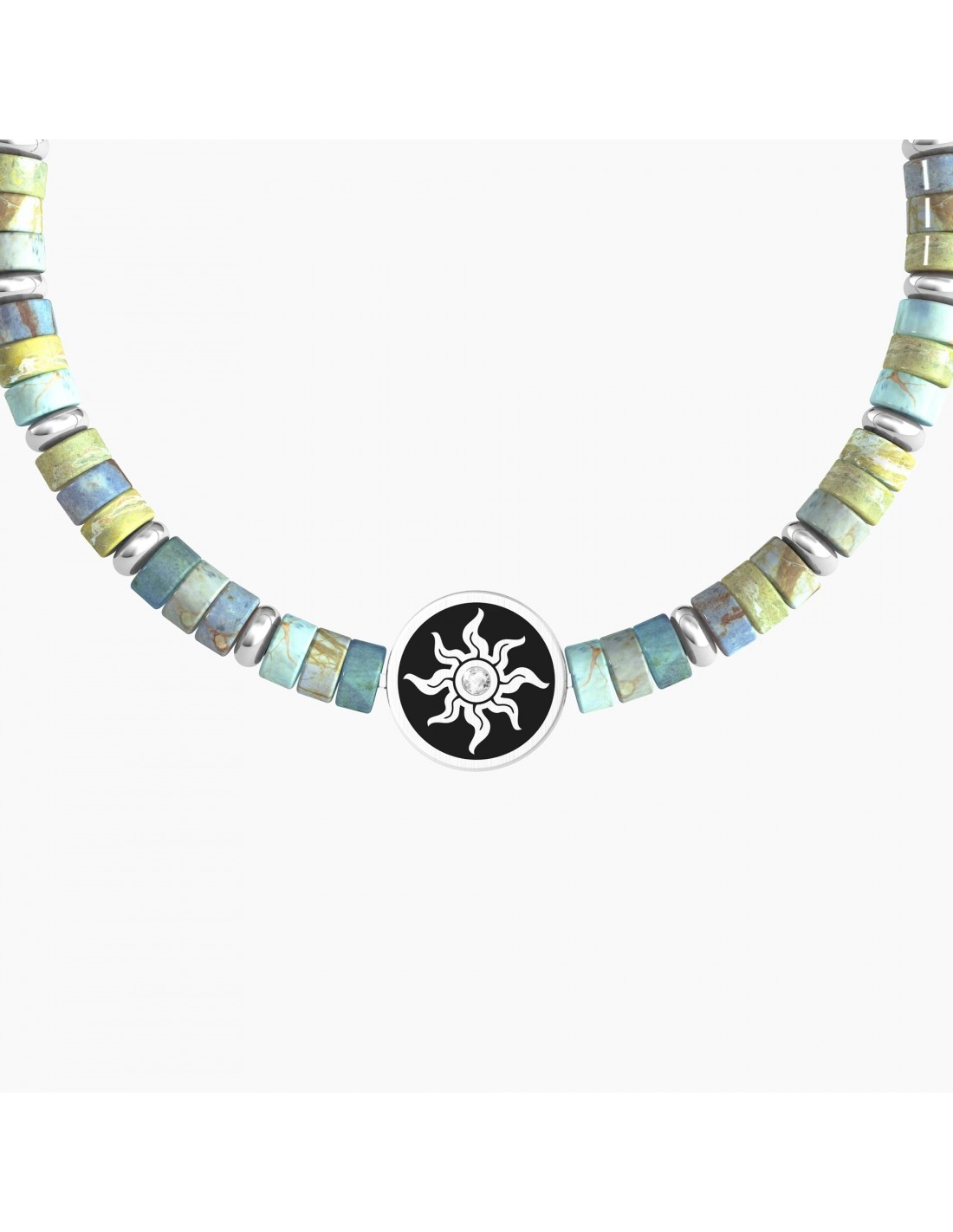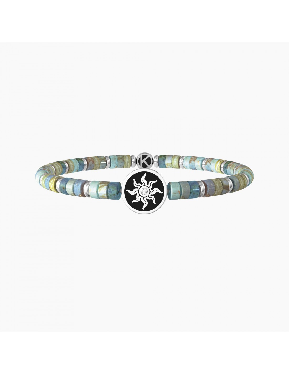 Come il sole che sorge ogni mattino, ogni giorno pu˜ portare con sŽ un nuovo inizio. Bracciale elastico con cilindri in diaspro azzurro alternati ad anelli in acciaio e piastra tonda di colore nero con sole e cristallo nero sul retro.
