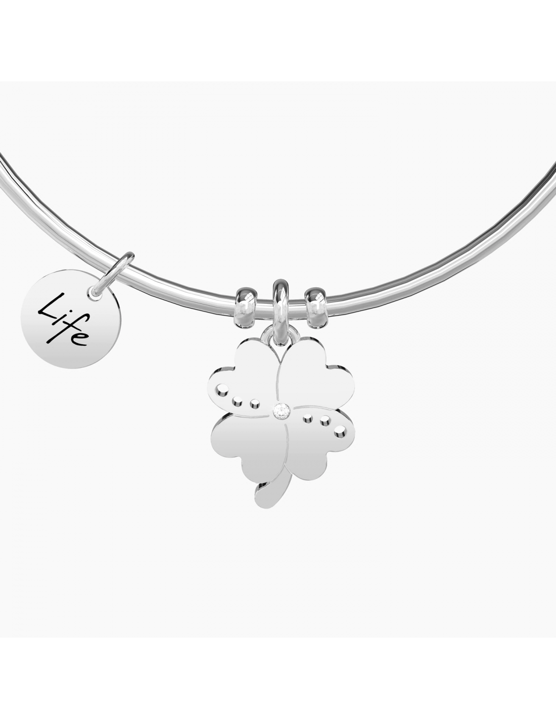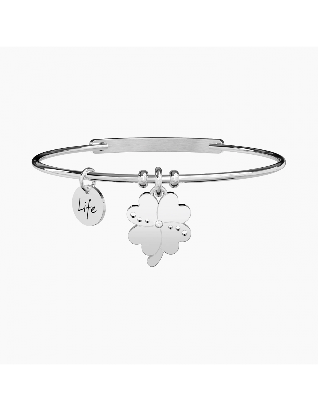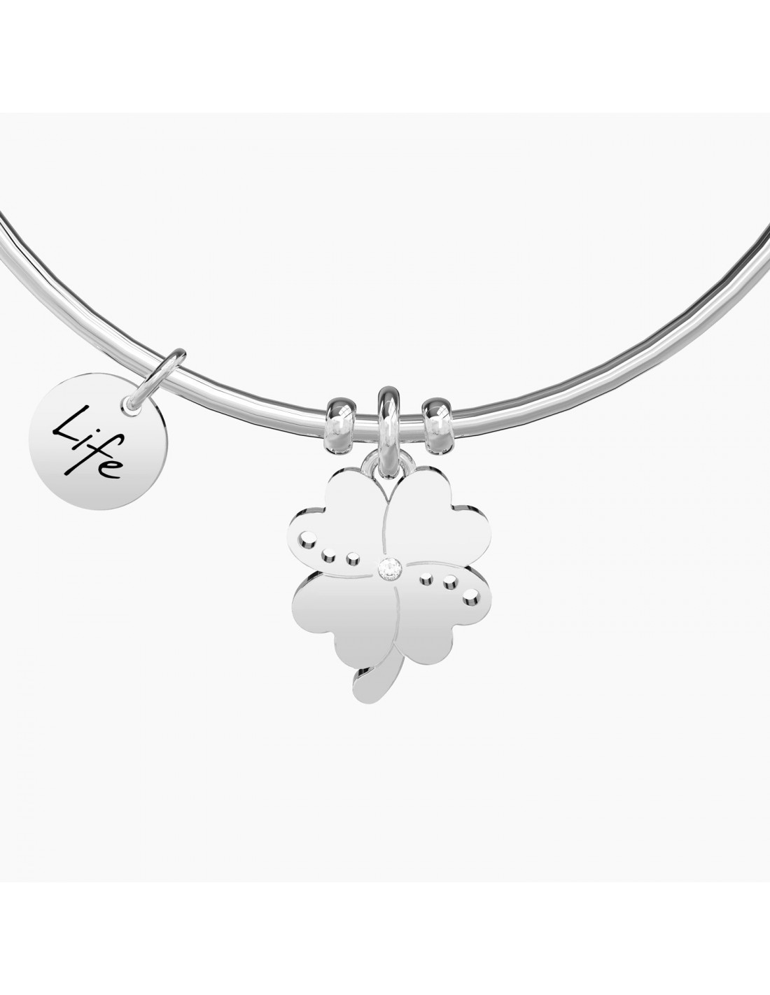 Il prato nasconde un verde talismano, se la fortuna ti vede ti prende per mano. Ricchezza, amore e amicizia sincera, con quattro foglie il tuo sogno si avvera! Bangle in acciaio con ciondolo Quadrifoglio.