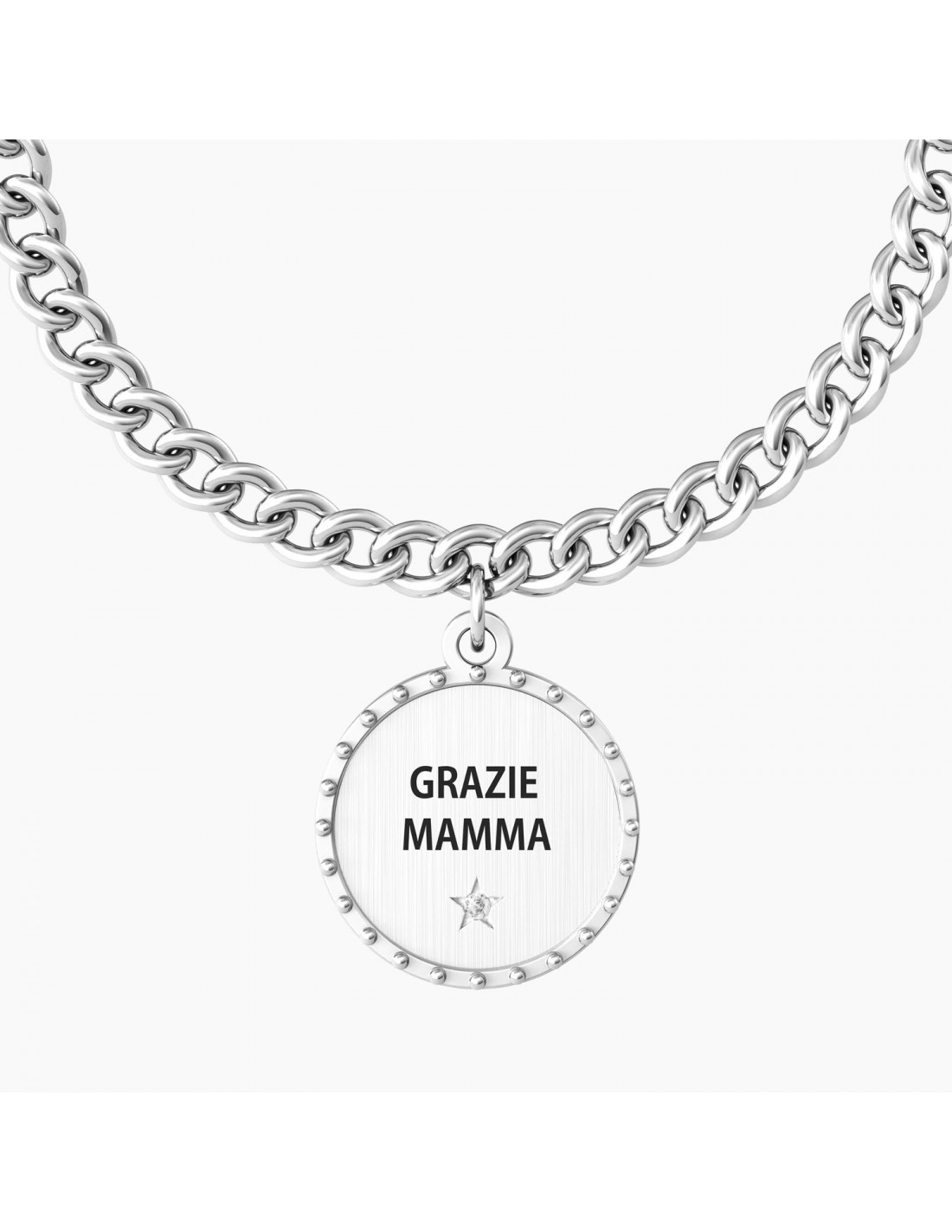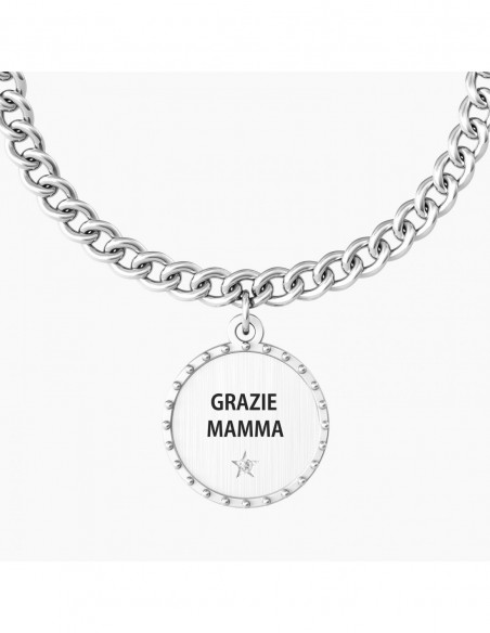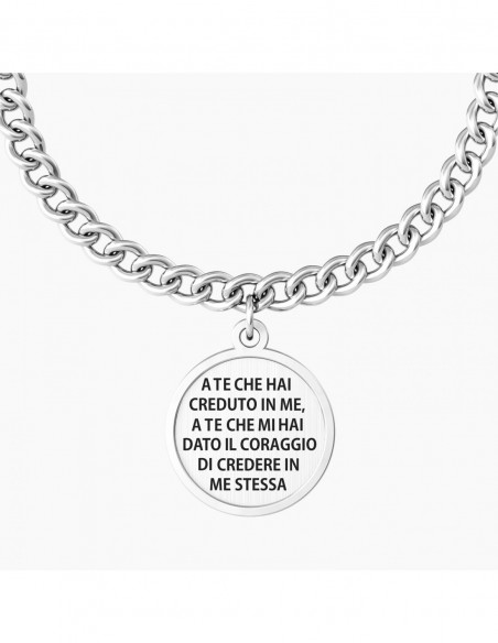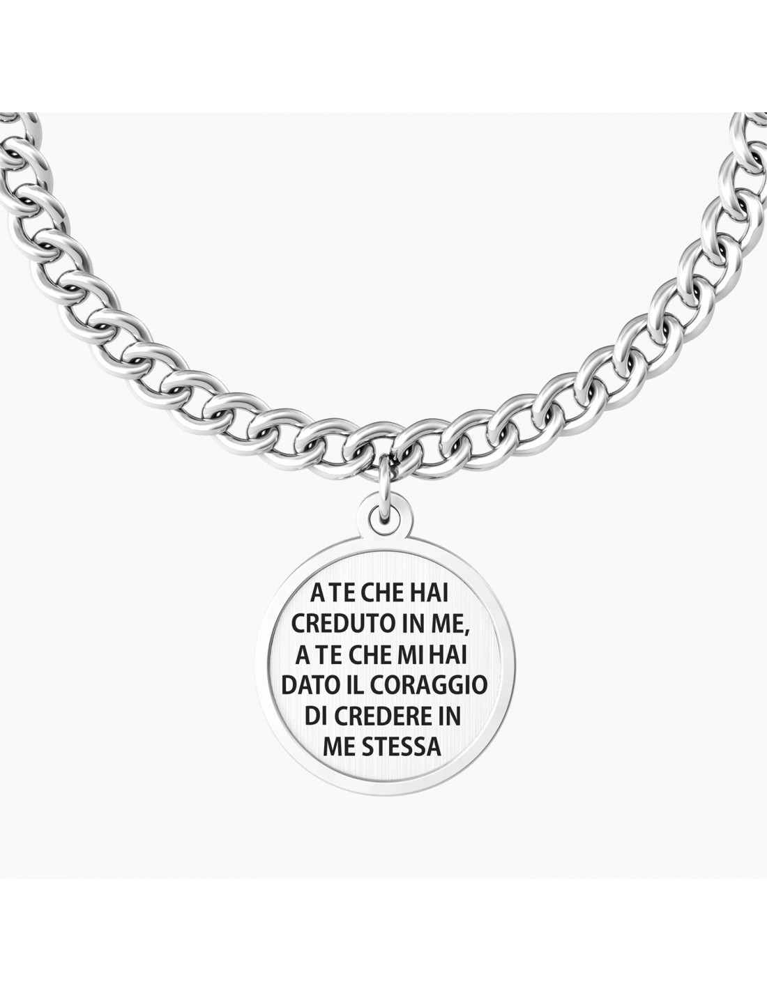 A te che hai creduto in me, a te che mi hai dato il coraggio di credere in me stessa Bracciale in acciaio con catena groumette "comfort fit" e ciondolo satinato tondo con rifinitura borchiata e cristallo.