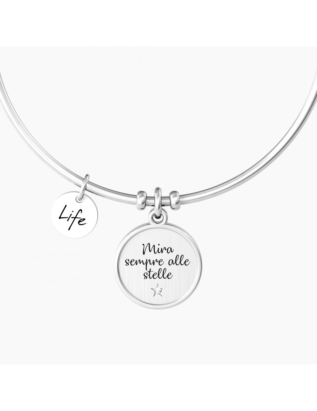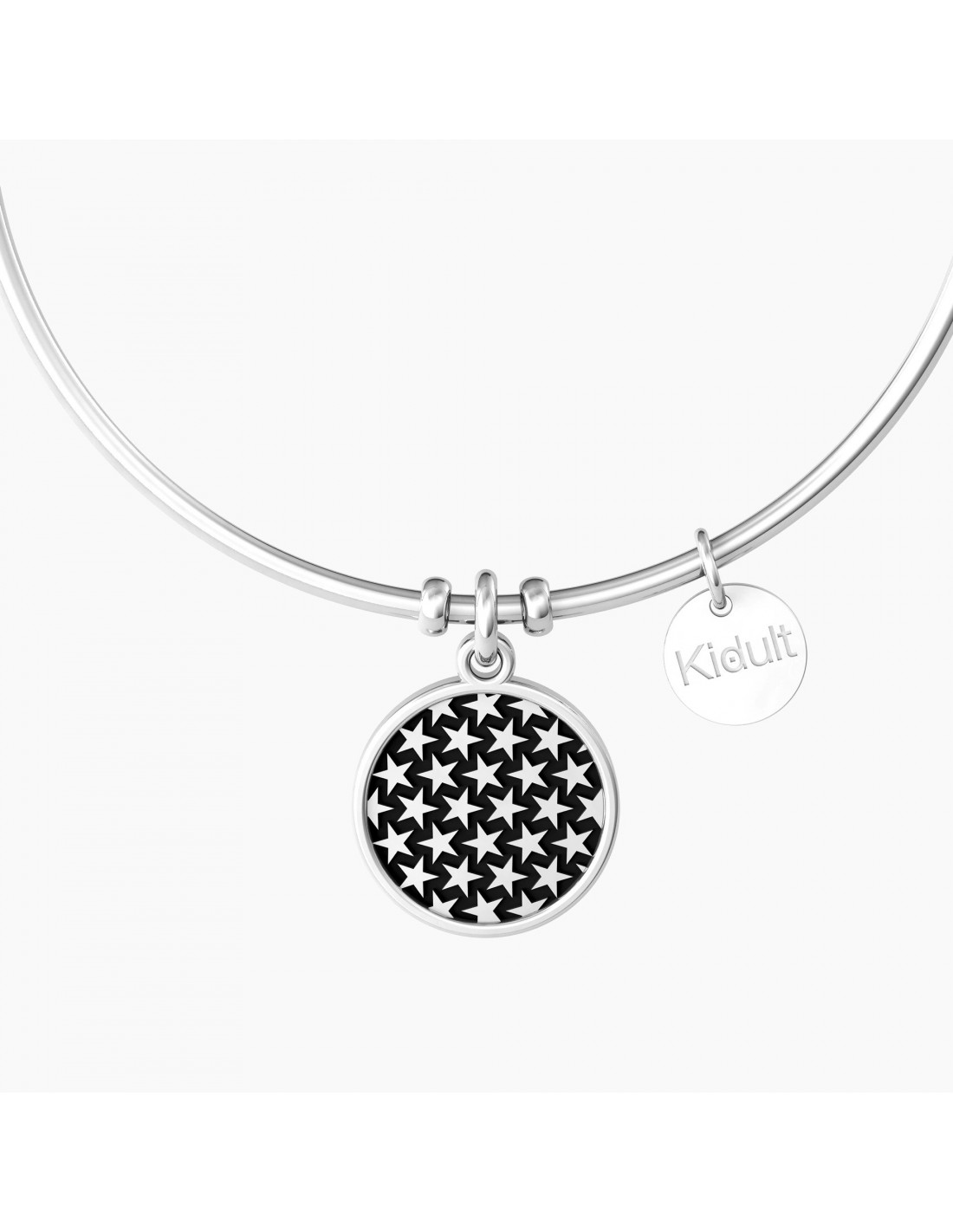Bangle in acciaio con ciondolo satinato tondo con rifinitura lucida e retro nero con stelle.
