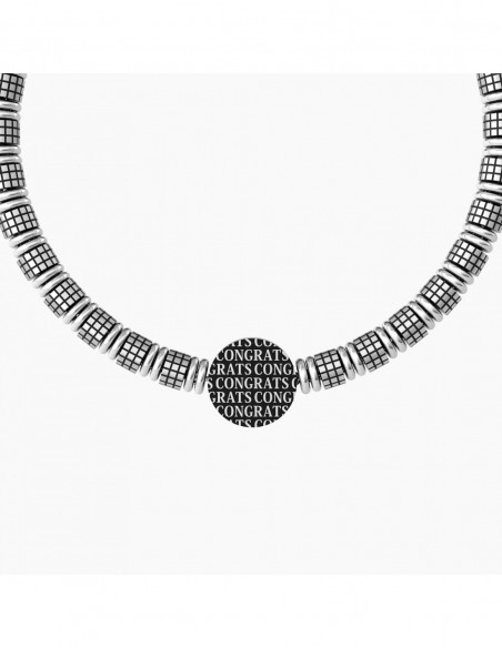 E questo  solo l'inizio di un mondo di soddisfazioni. Congratulazioni Dottore, siamo davvero orgogliosi di te! Bracciale in acciaio satinato con cilindri con texture quadrata alternati ad anelli e piastra satinata tonda con retro nero.