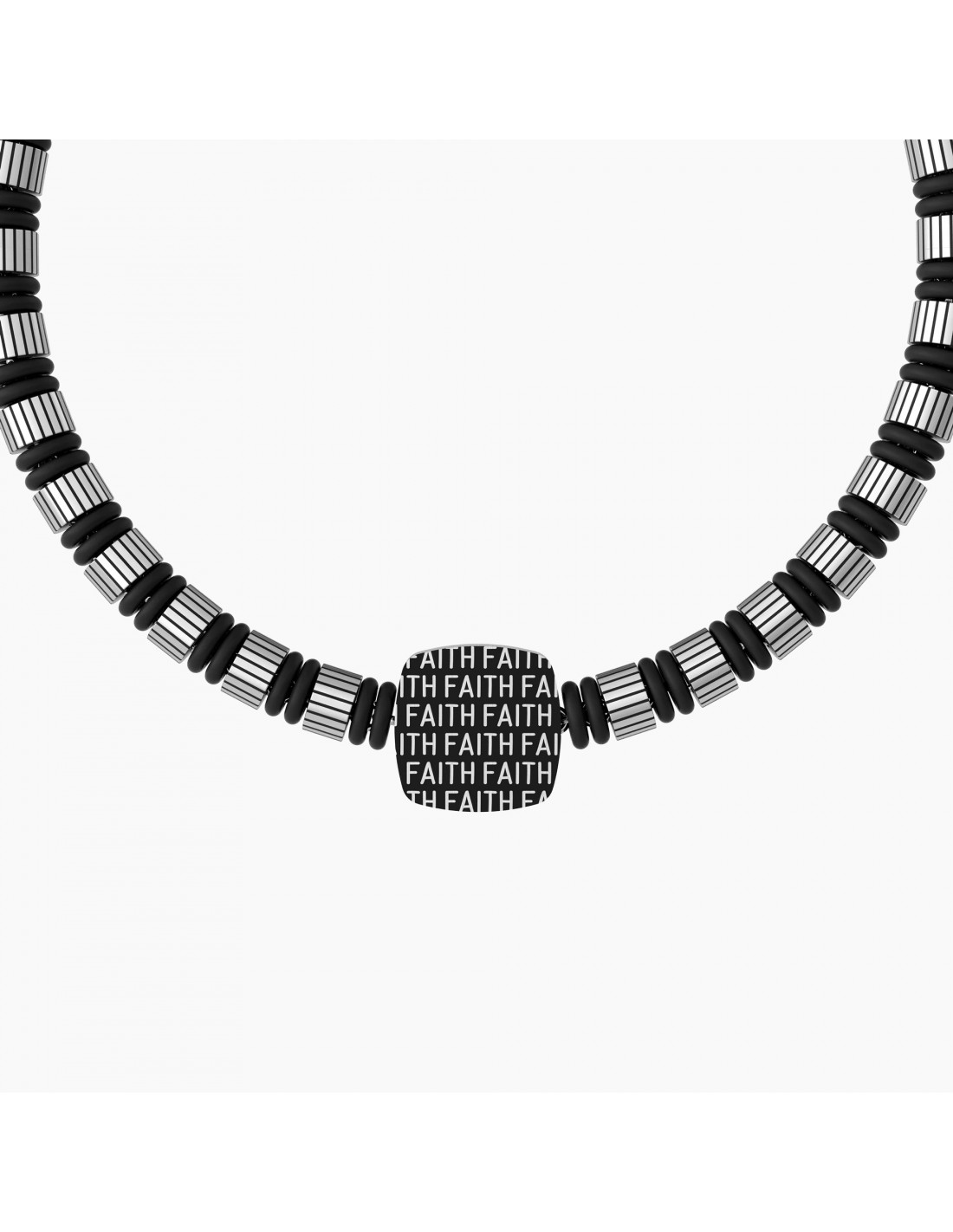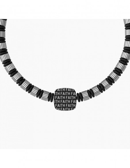"Credere"  il segreto per vincere tutte le sfide della tua vita. Bracciale in acciaio satinato con cilindri con texture rigata alternati ad anelli di colore nero e piastra satinata quadrata con croce e retro nero.