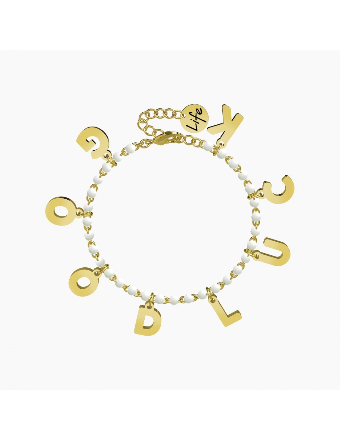 Sorridi agli imprevisti e accetta l'imprevedibile. La buona sorte ti sorriderˆ. Bracciale in acciaio color oro rosa con ciondoli Good Luck e catena rol˜ con inserimenti in smalto bianco.