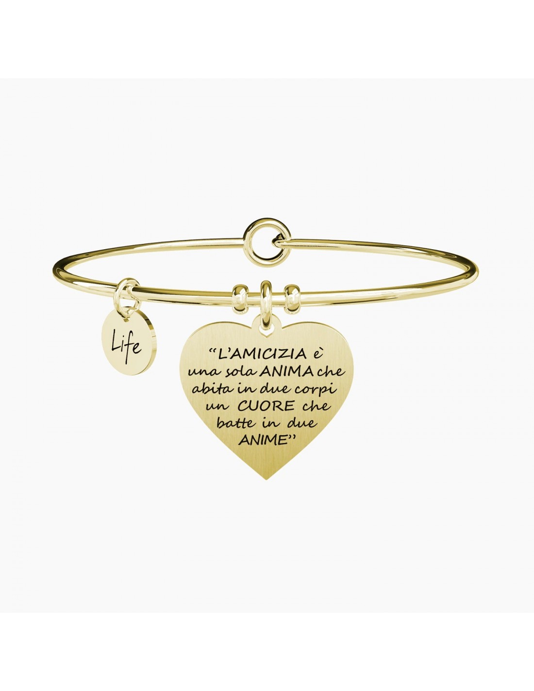 "L'amicizia  una sola anima che abita in due corpi, un cuore che batte in due anime." - Aristotele - Bangle in acciaio color oro giallo con ciondolo satinato a cuore.
