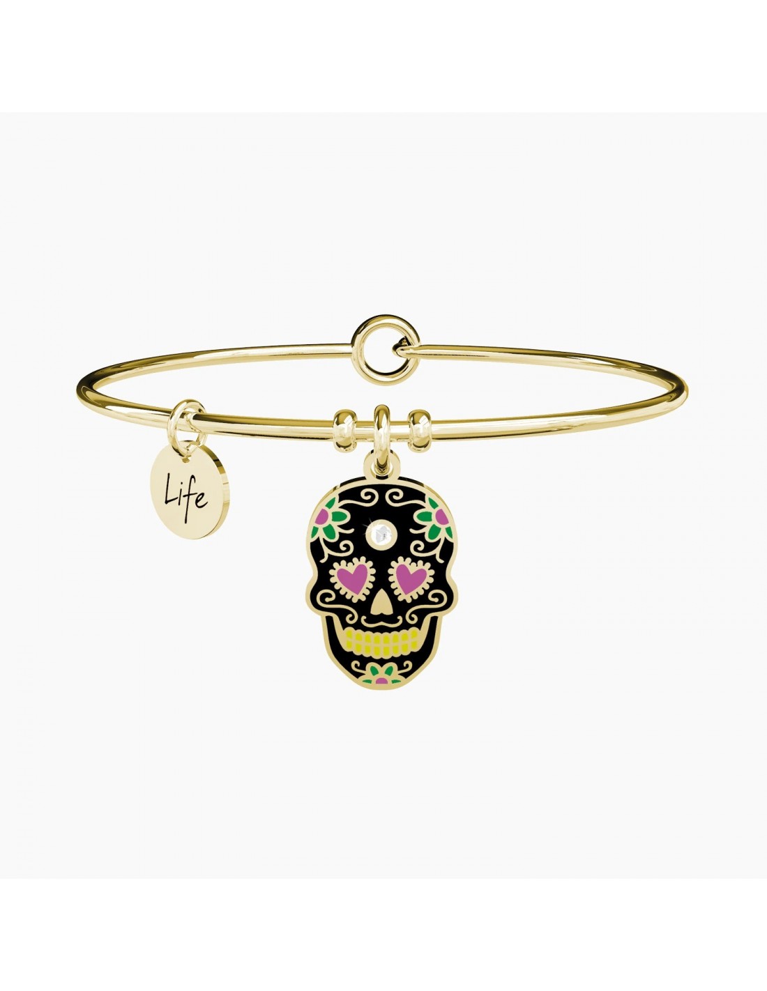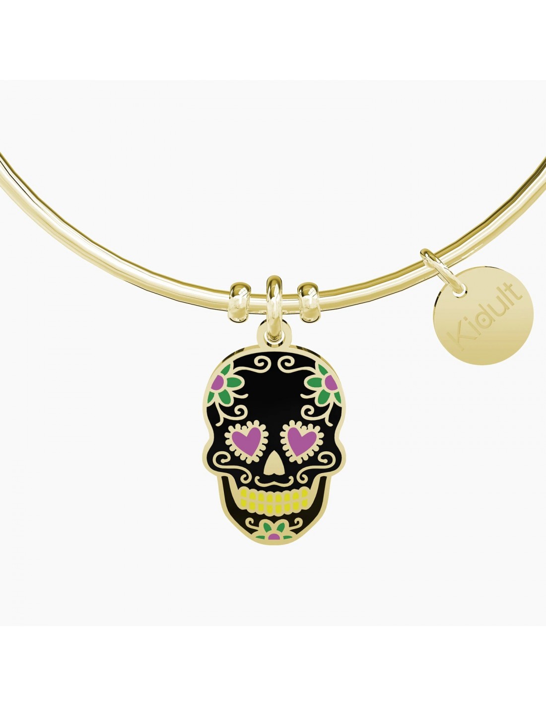Porta con te questo potente simbolo di protezione che sorride all'ignoto. Colori, allegria e niente tristezza per poter vivere con gioia anche la pi grande delle paure. Bangle in acciaio color oro giallo con ciondolo a forma di teschio messicano smaltato.