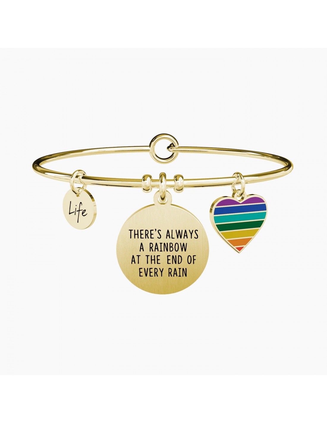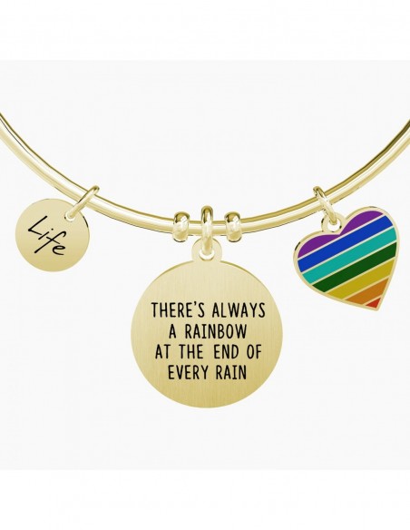 Bangle in acciaio color oro giallo con ciondoli satinato tondo e a cuore smaltato multicolor.