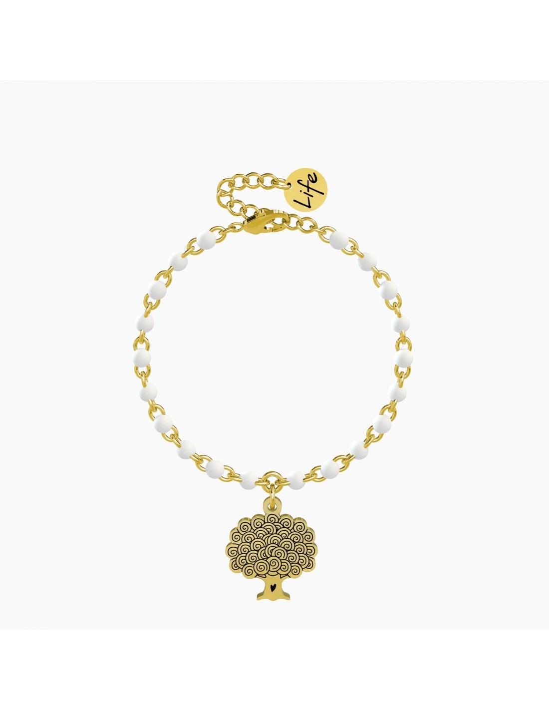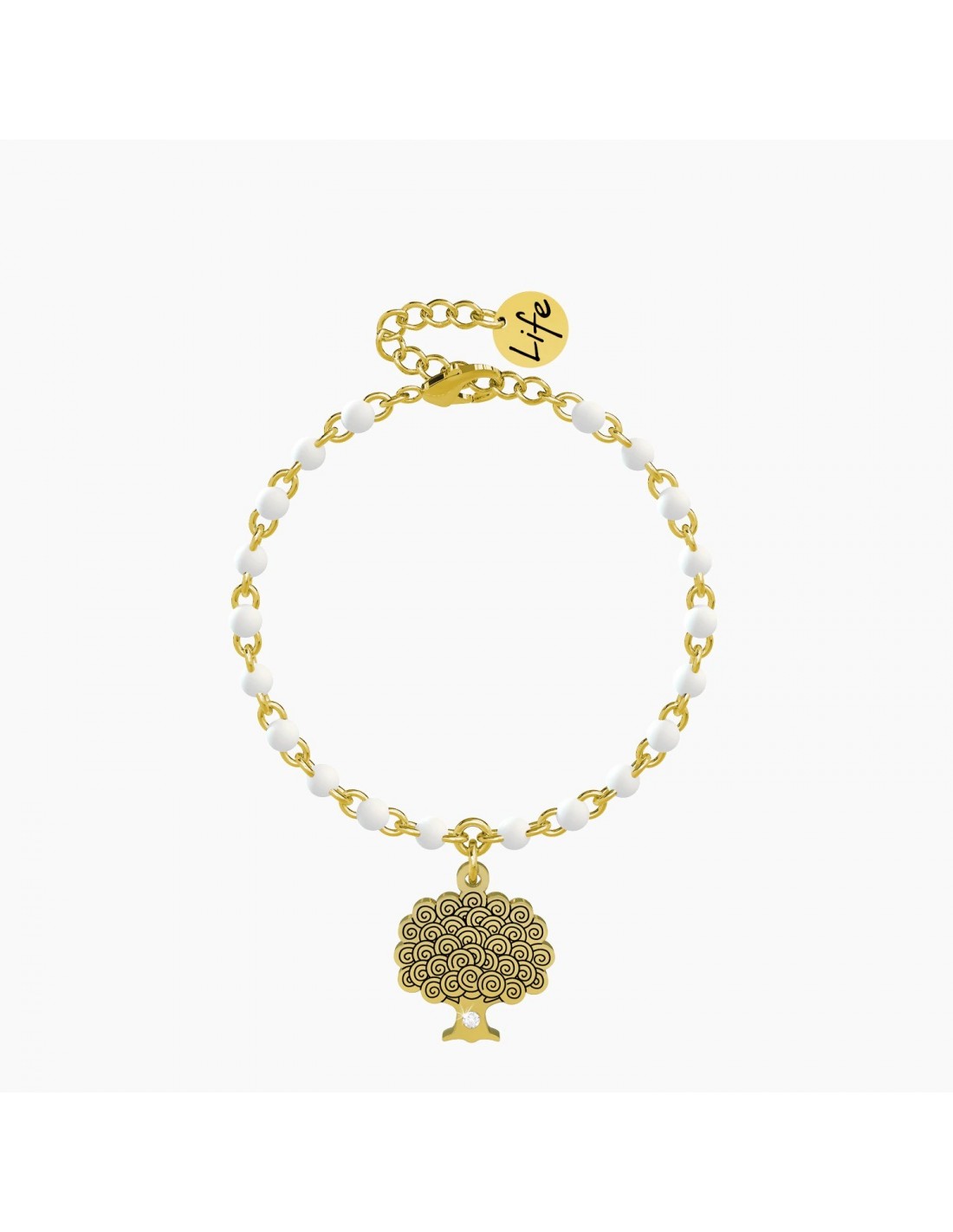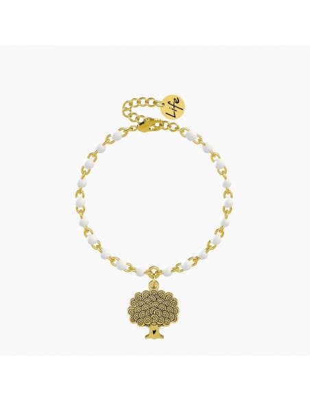 "L'amore, una volta sbocciato mette radici che non smettono pi di crescere." - A. de Saint-ExupŽry - Bracciale in acciaio color oro giallo con ciondolo a forma di albero e catena rol˜ con inserimenti in smalto bianco.