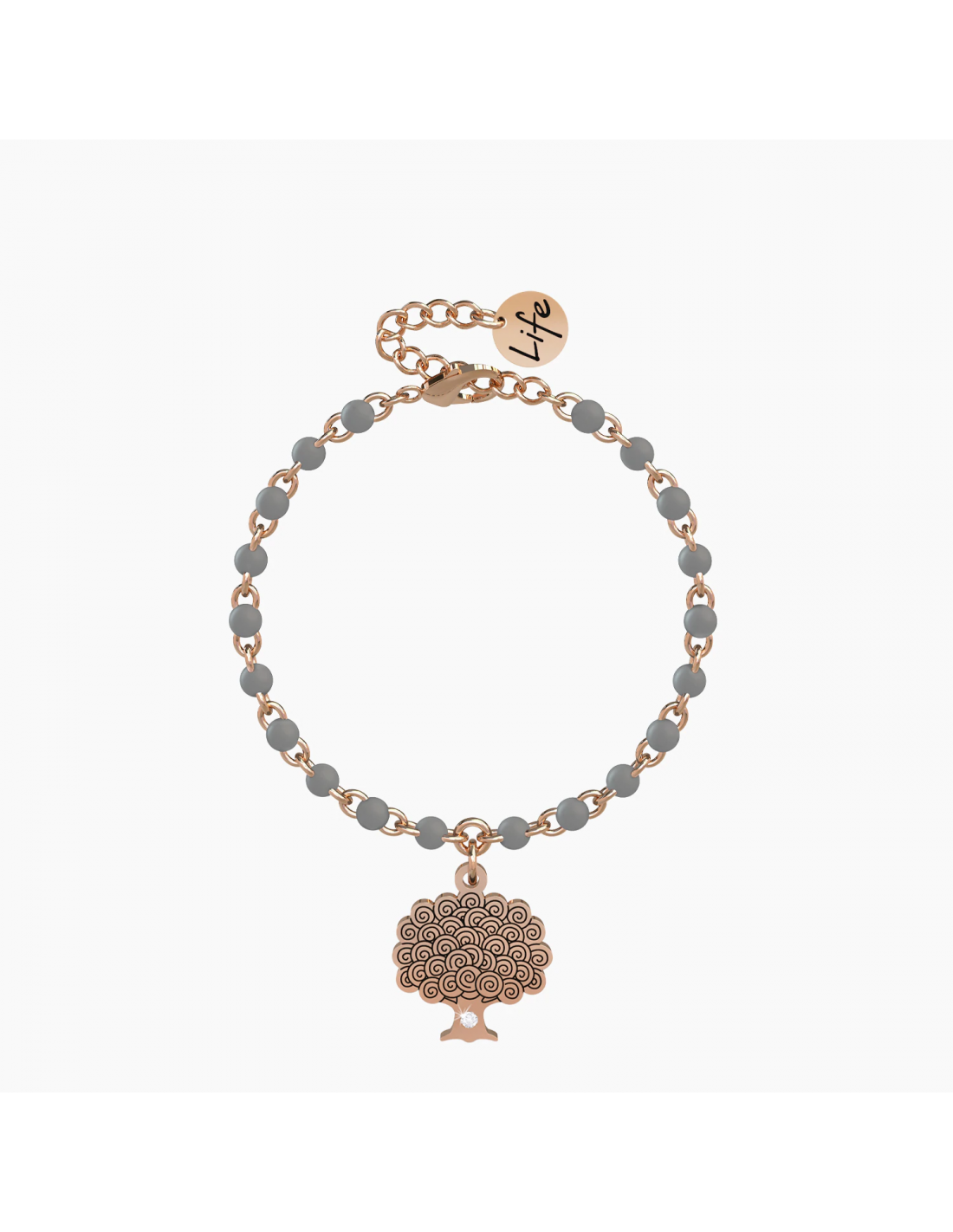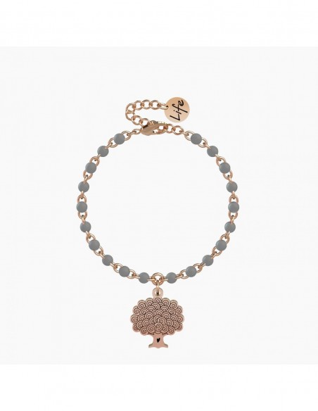 "L'amore, una volta sbocciato mette radici che non smettono pi di crescere." - A. de Saint-ExupŽry - Bracciale in acciaio color oro rosa con ciondolo ad albero e catena rol˜ con inserimenti in smalto grigio.