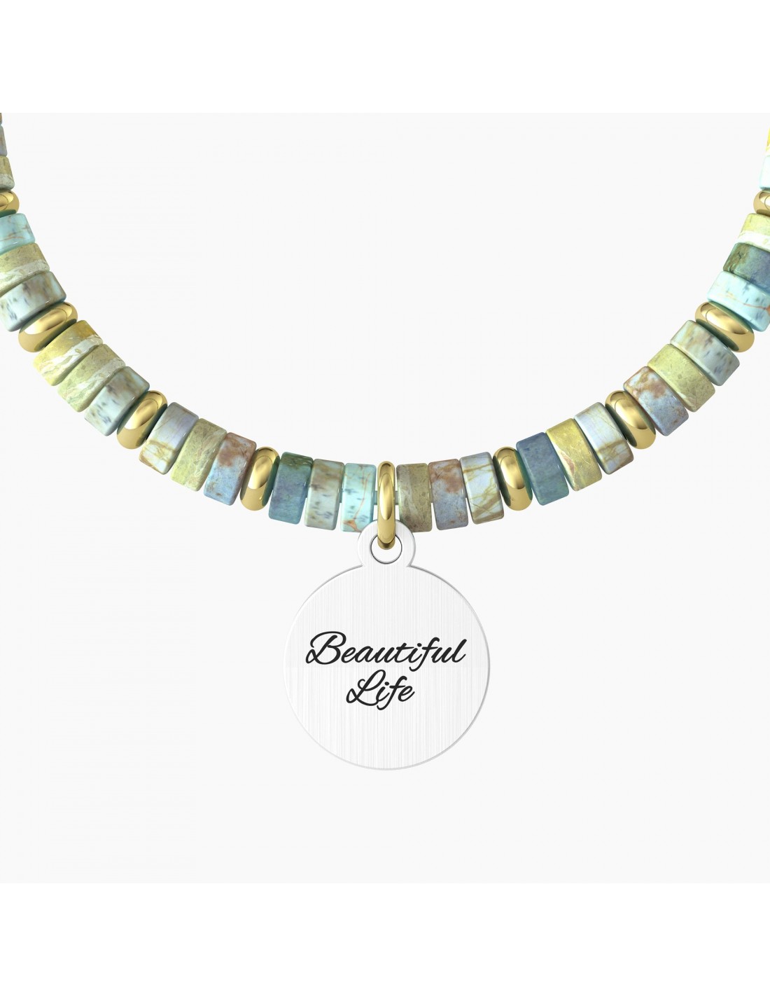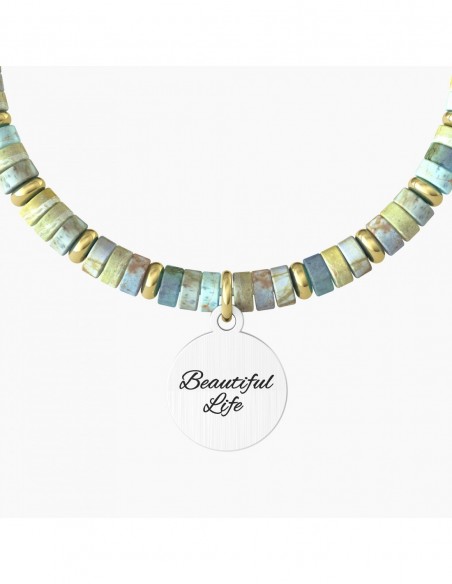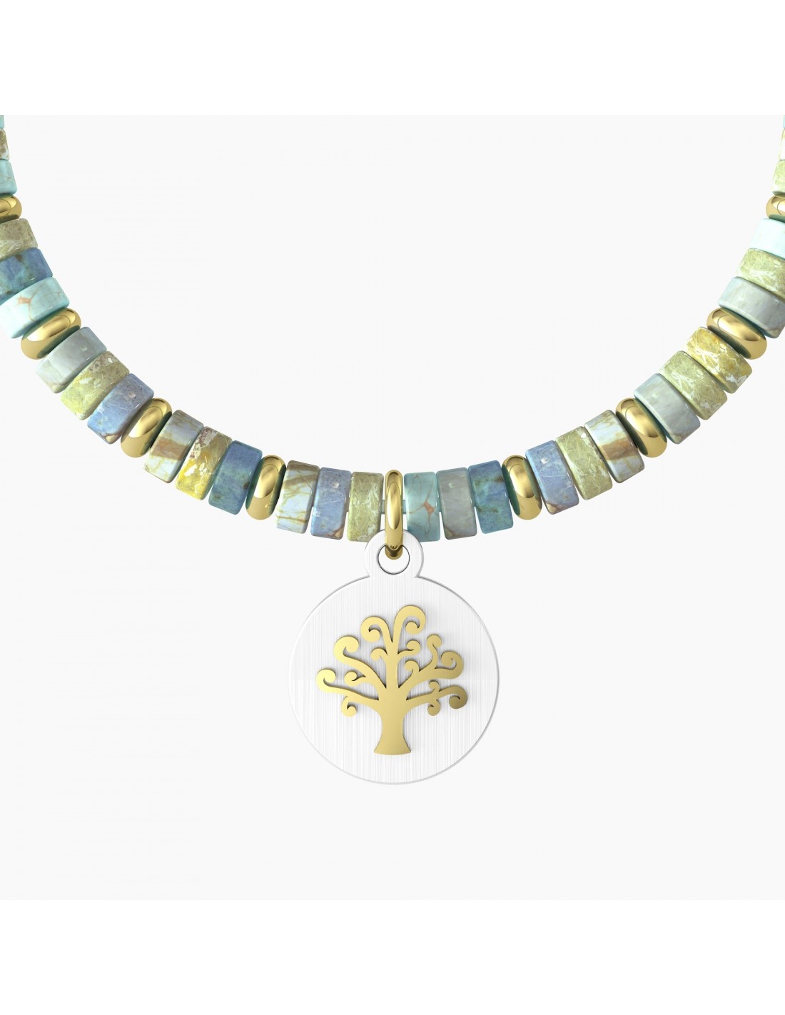 La vita bella e la bellezza la migliore promessa di felicit. Bracciale elastico con cilindri in diaspro azzurro alternati ad anelli in acciaio color oro giallo e ciondolo satinato tondo con albero della vita in rilievo color oro giallo.