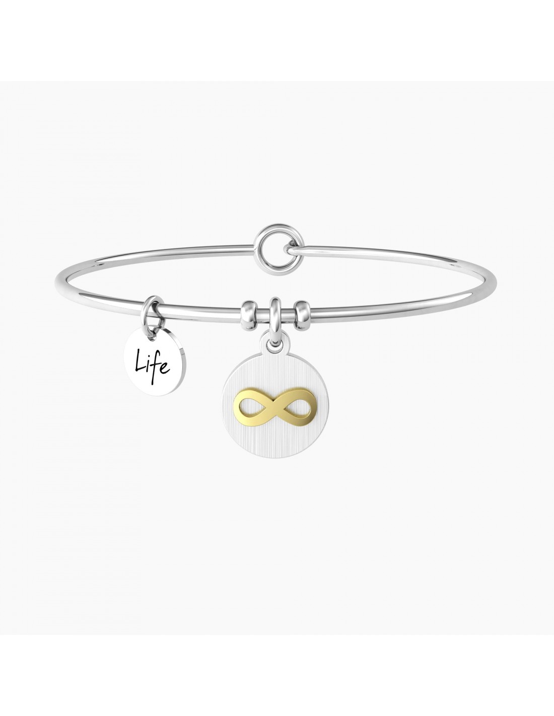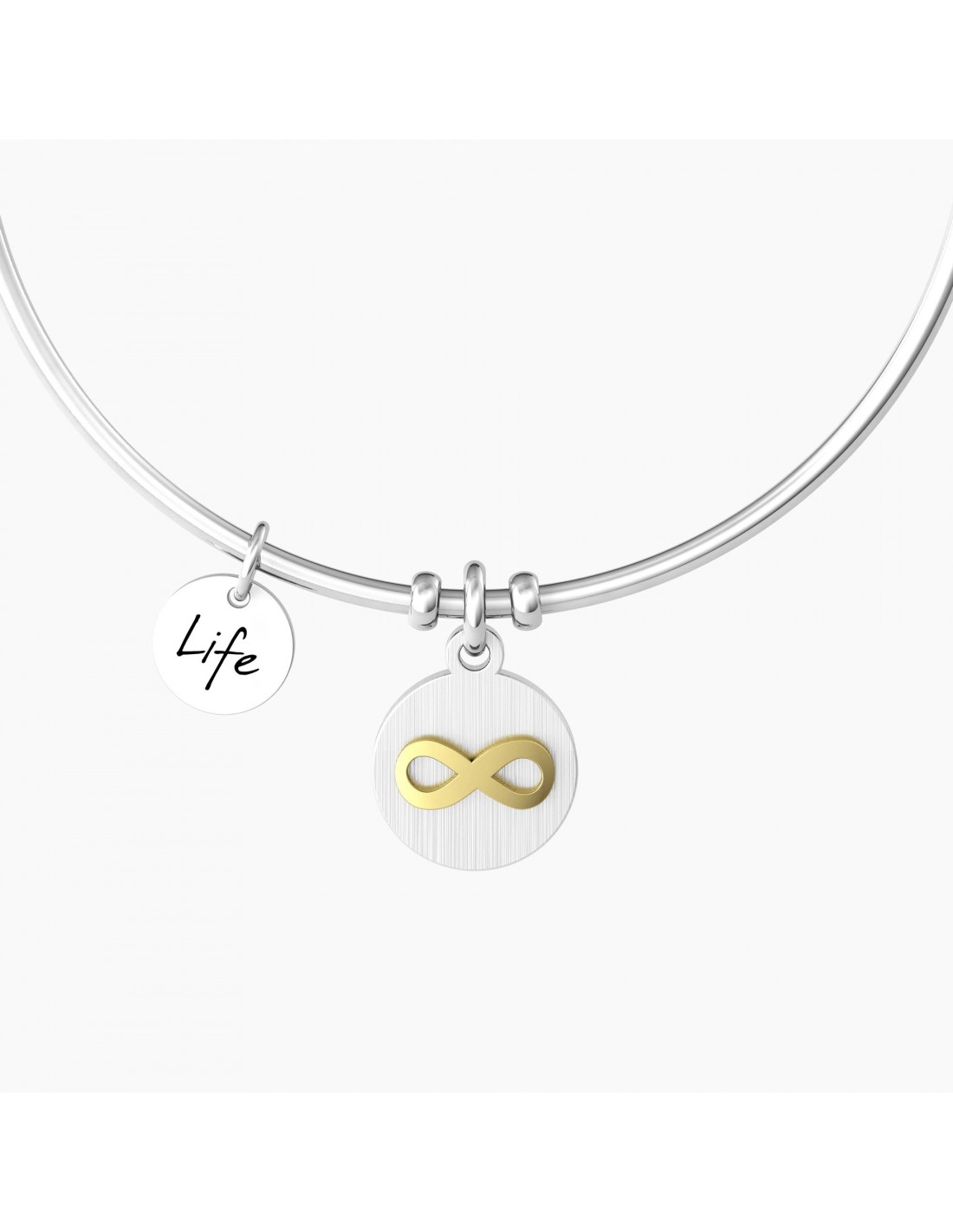 Ama e vivi intensamente ogni istante della tua vita. é questa la strada per essere infinitamente felice. Bangle in acciaio con ciondolo satinato tondo con infinito in rilievo color oro giallo.