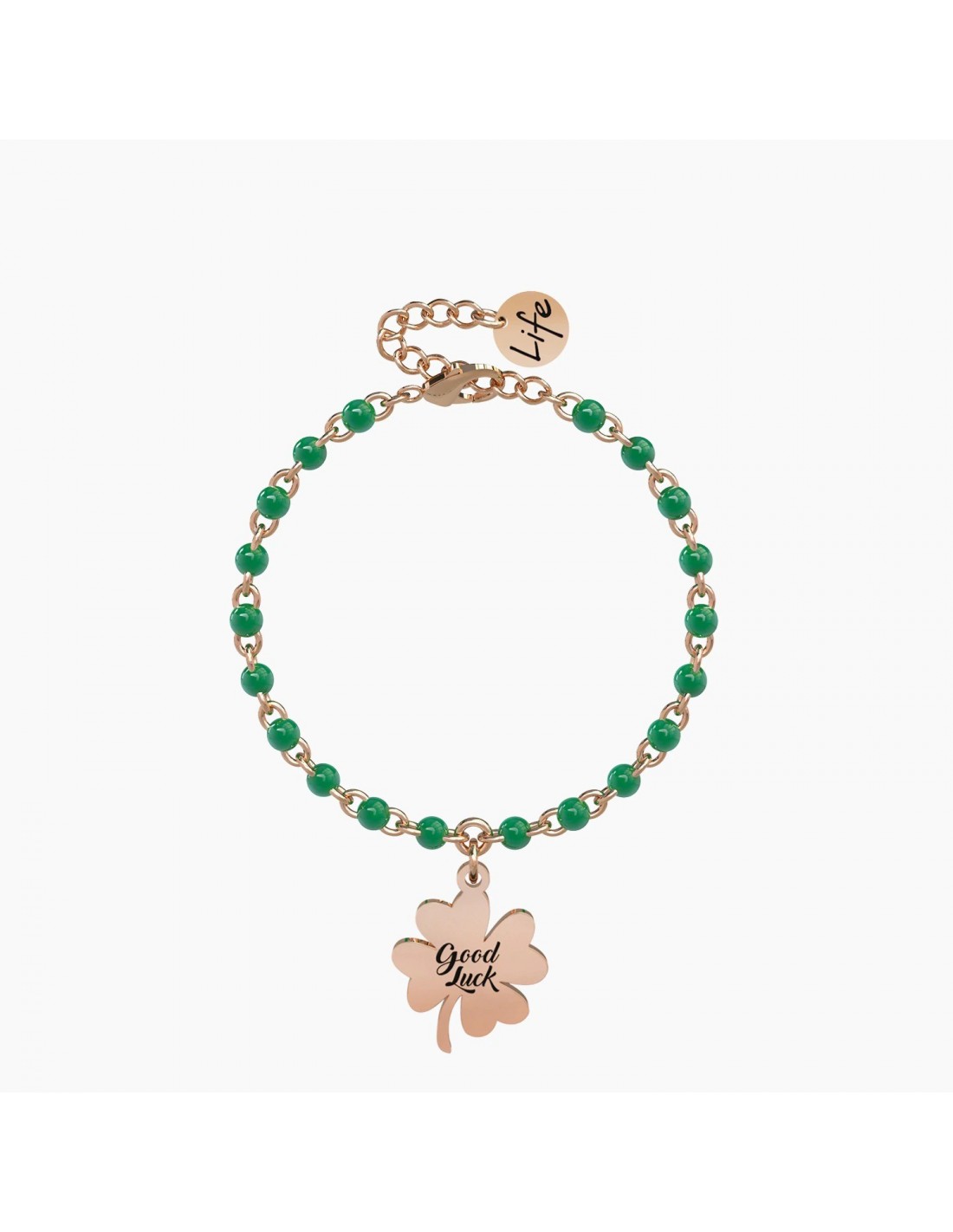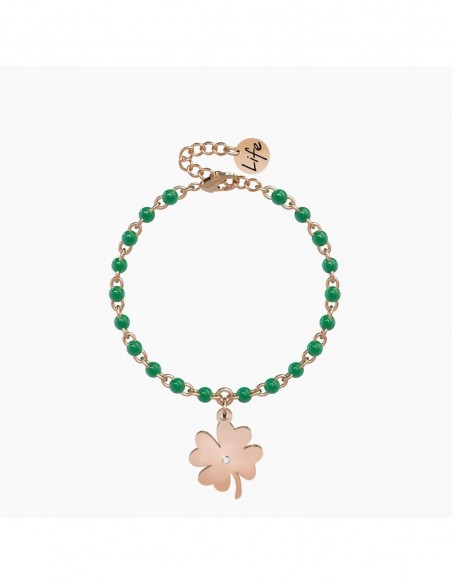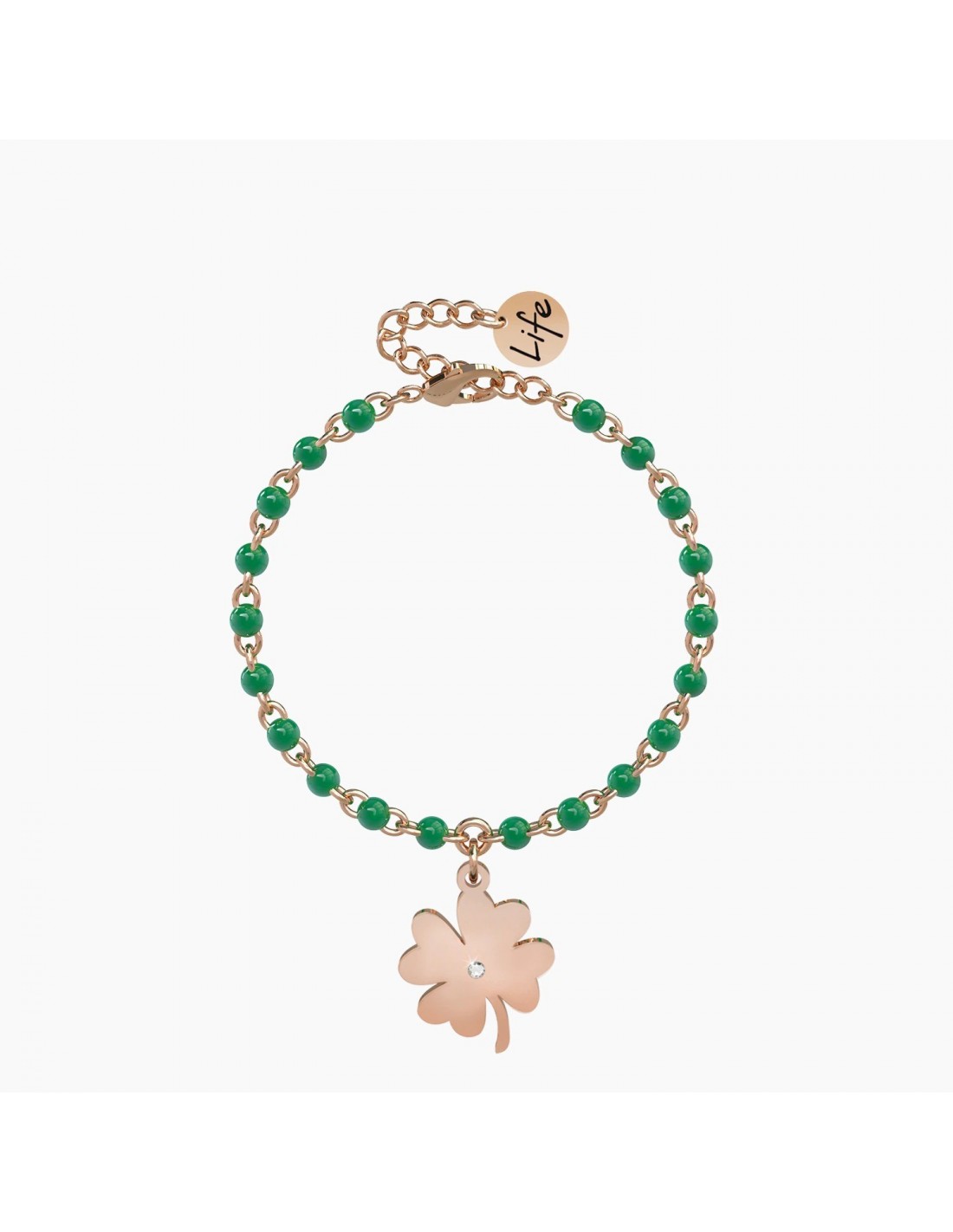 Bracciale in acciaio color oro rosa con ciondolo a quadrifoglio e catena rol con inserimenti in smalto verde.
