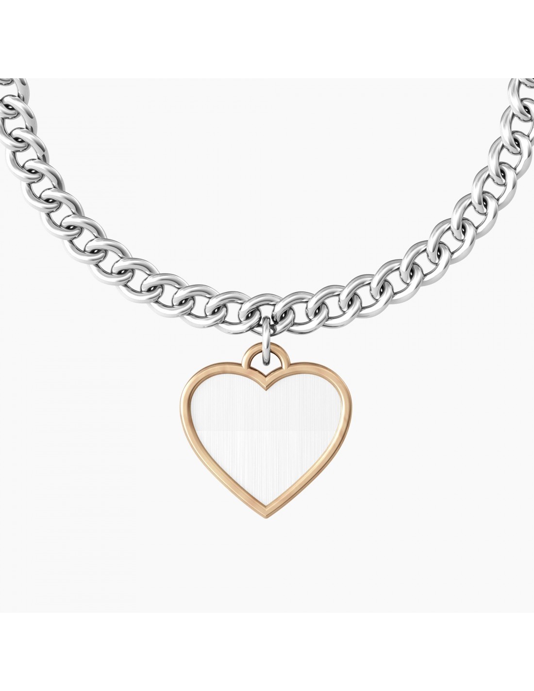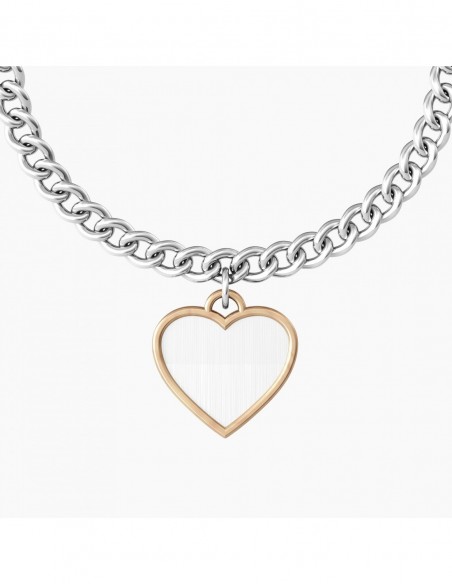 Bracciale in acciaio con catena groumette "comfort fit" e ciondolo satinato a cuore con rifinitura lucida color oro rosa e cristallo.