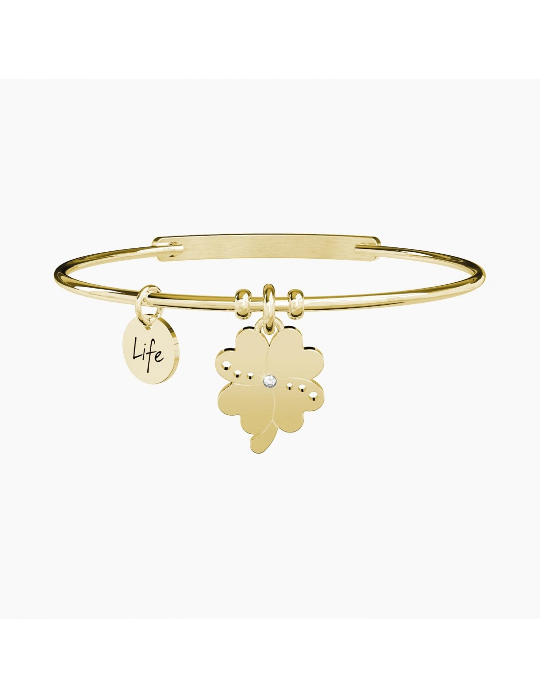 Il prato nasconde un verde talismano, se la fortuna ti vede ti prende per mano. Ricchezza, amore e amicizia sincera, con quattro foglie il tuo sogno si avvera! Bangle in acciaio color oro giallo con ciondolo Quadrifoglio.