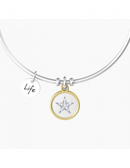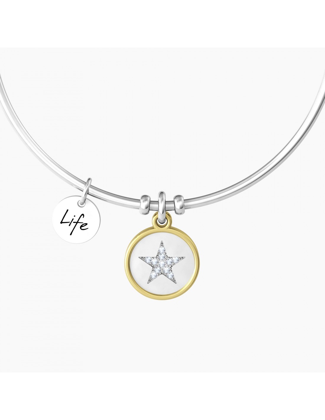 Sei la luce che illumina la nostra vita, il sole che ci rende felici ogni giorno. Figlia, sei la nostra stella. Bangle in acciaio con ciondolo satinato tondo con rifinitura lucida color oro giallo e stella in cristalli.