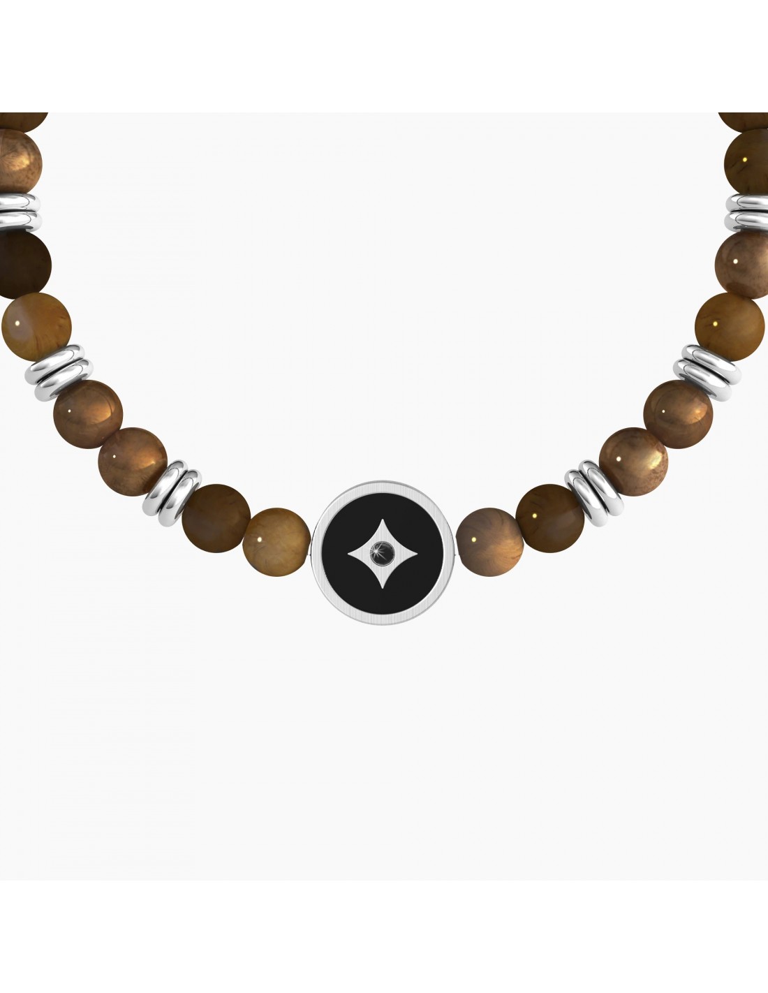 Non mollare mai, anche quando la strada diventa piena di ostacoli. é proprio questa la differenza tra chi abbandona e chi raggiunge i suoi obiettivi. Bracciale elastico con sfere in occhio di tigre alternate ad anelli in acciaio e piastra tonda di colore nero con rifinitura borchiata e cristallo nero sul retro.