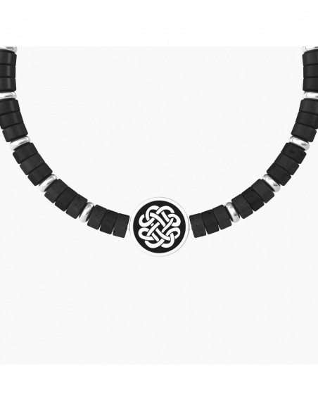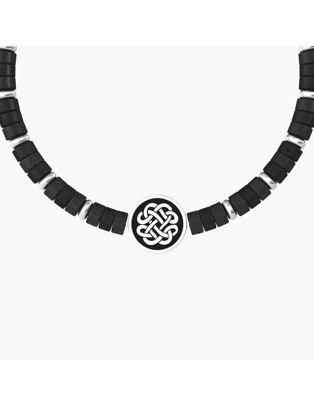 Impara dal passato e immagina il futuro, ma non scordarti mai di vivere intensamente il presente. Bracciale elastico con cilindri in pietra lavica alternati ad anelli in acciaio e piastra tonda di colore nero con retro con rifinitura borchiata.