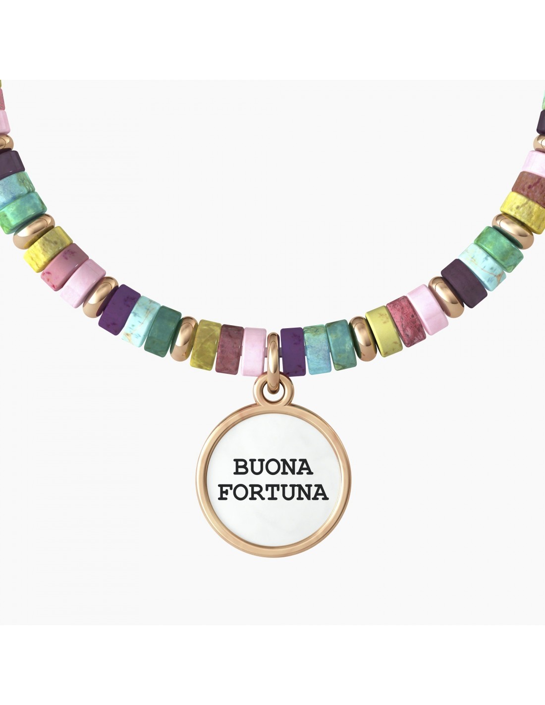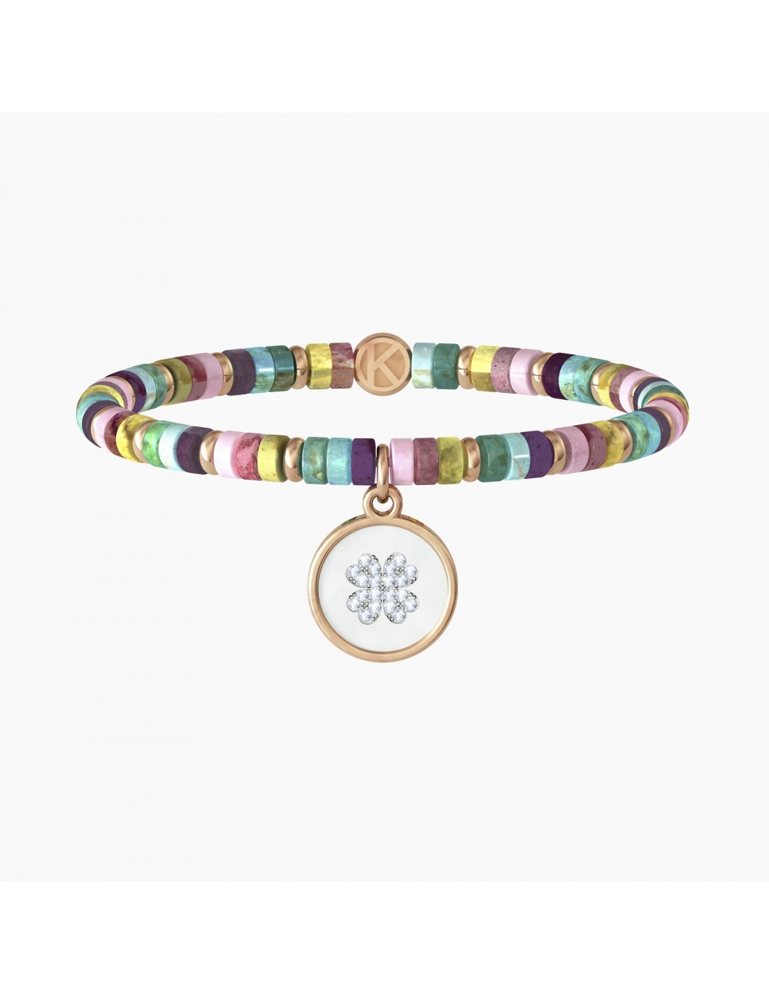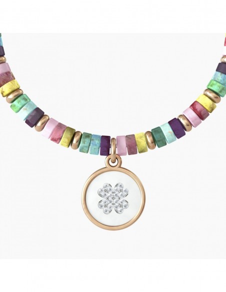 Bracciale elastico con cilindri in pietre multicolor alternati ad anelli color oro rosa e ciondolo satinato tondo con quadrifoglio in cristalli e rifinitura color oro rosa.