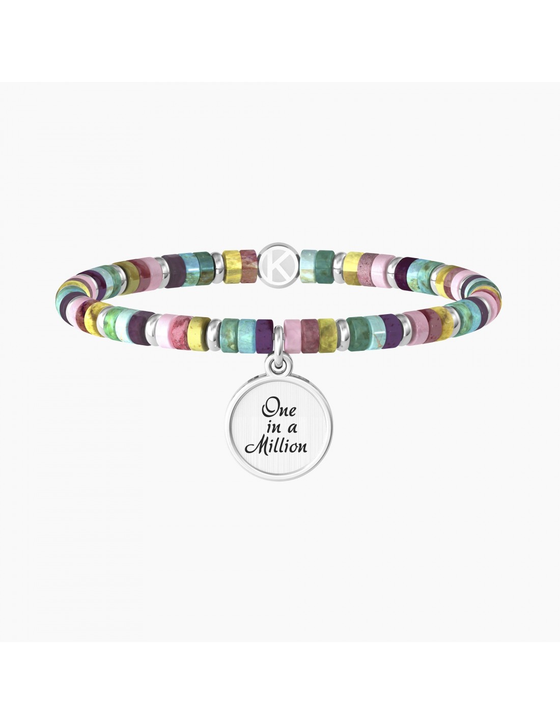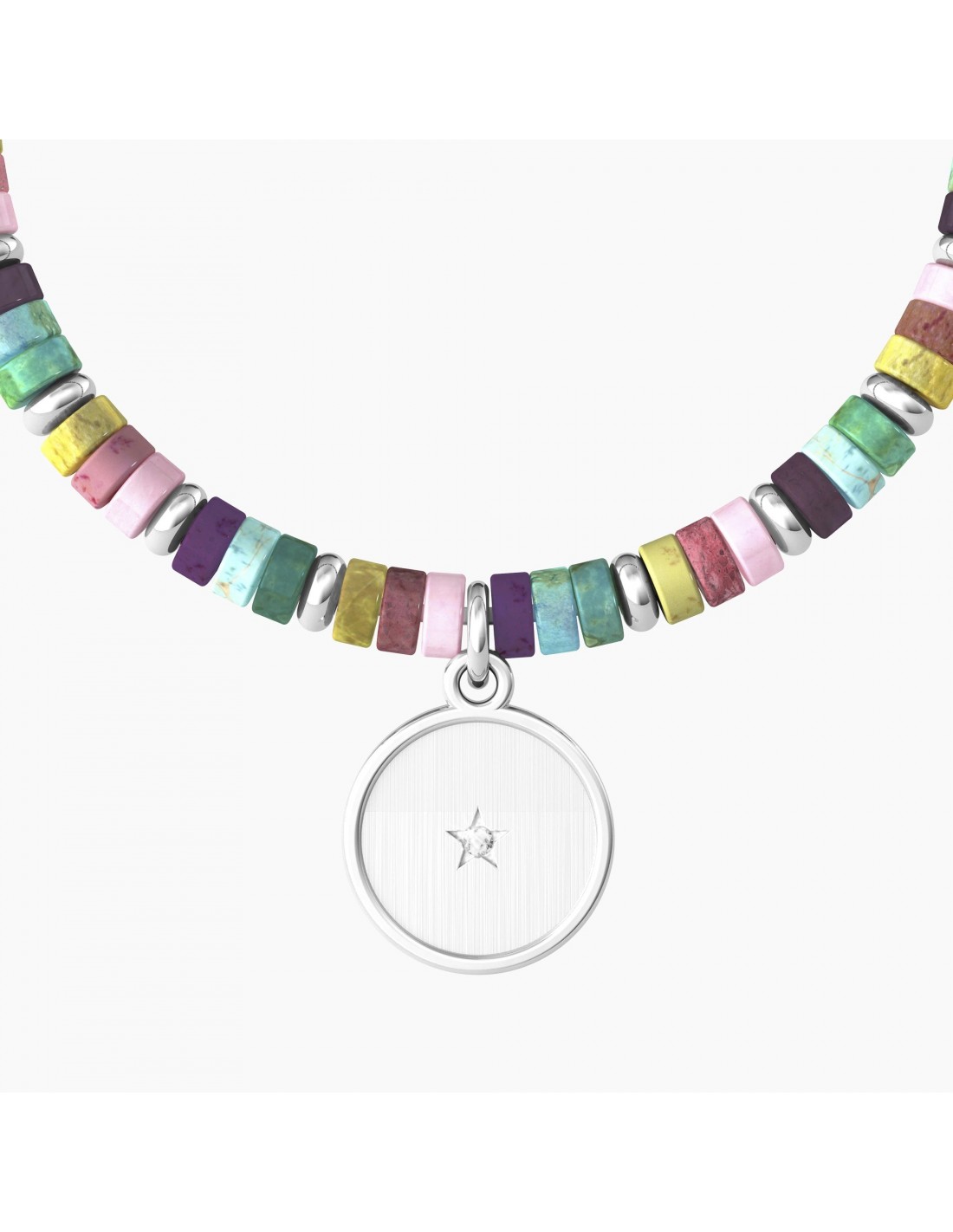 Bracciale elastico con cilindri in pietre multicolor alternati ad anelli in acciaio e ciondolo satinato tondo.