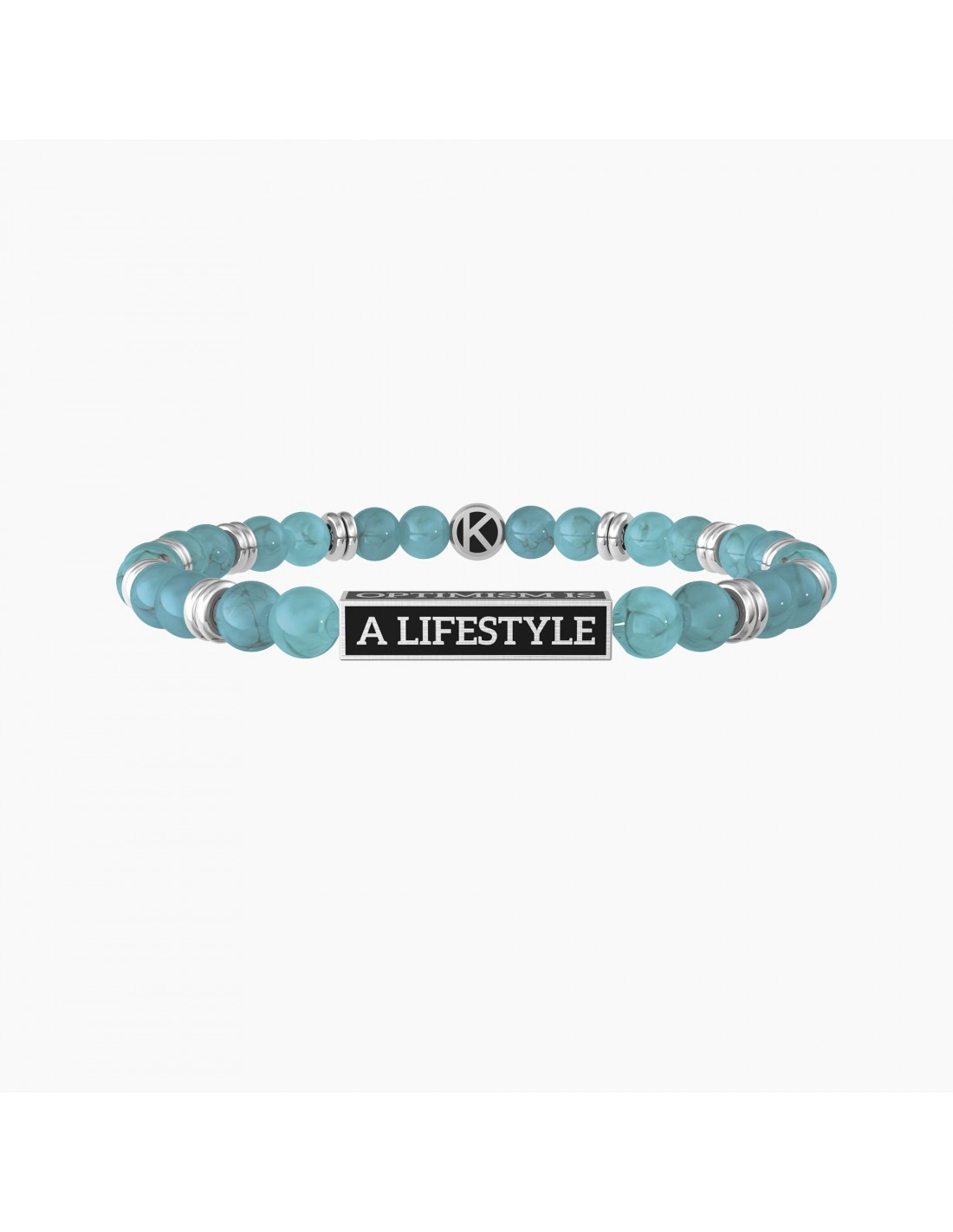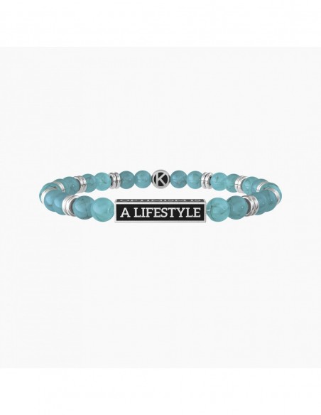 Bracciale elastico con sfere in turchese alternate ad anelli in acciaio e piastra rettangolare di colore nero.