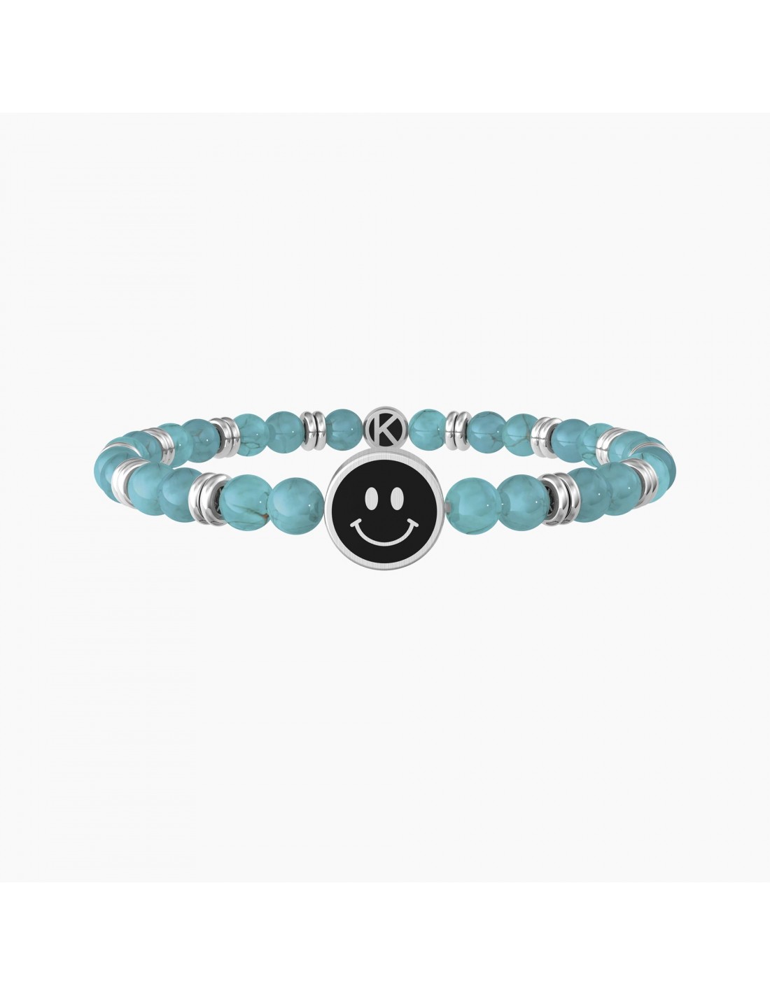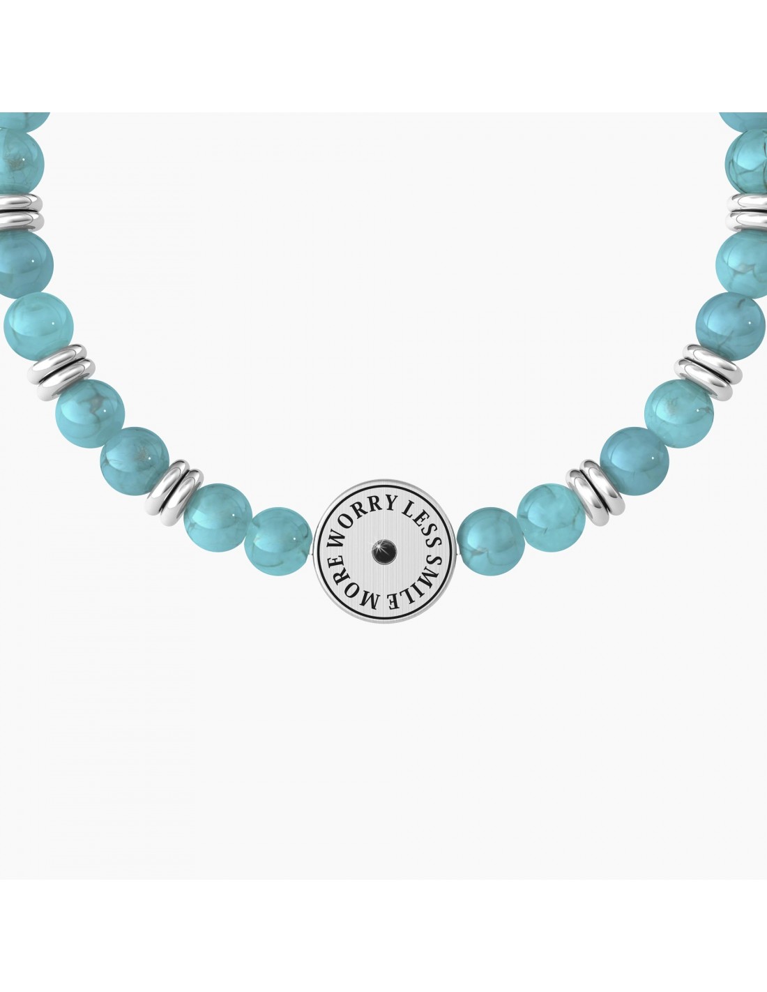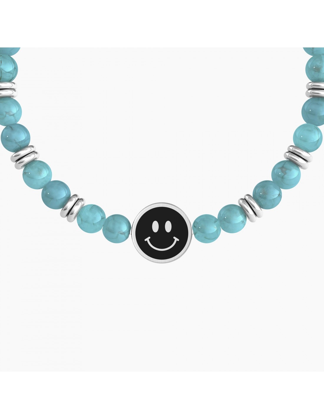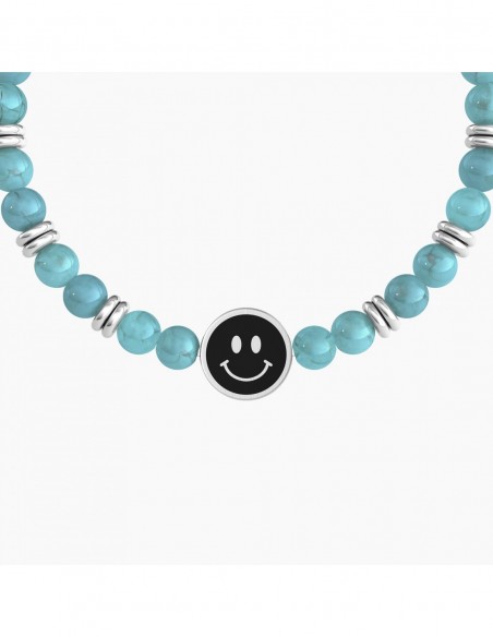 C' sempre un motivo per essere felici. Mentre lo cerchiÉ inizia a sorridere! Bracciale elastico con sfere in turchese alternate ad anelli in acciaio e piastra tonda di colore nero con cristallo nero sul retro.