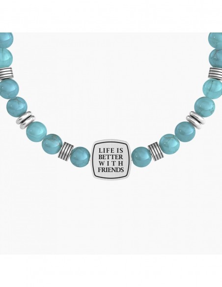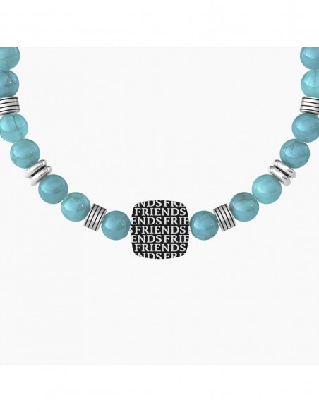 Il bello di condividere un'avventura, un'emozione, un sorriso. La vita pi bella se vissuta con amici speciali come te! Bracciale elastico con sfere in turchese alternate a cilindri rigati e anelli in acciaio, con piastra satinata quadrata con retro nero.