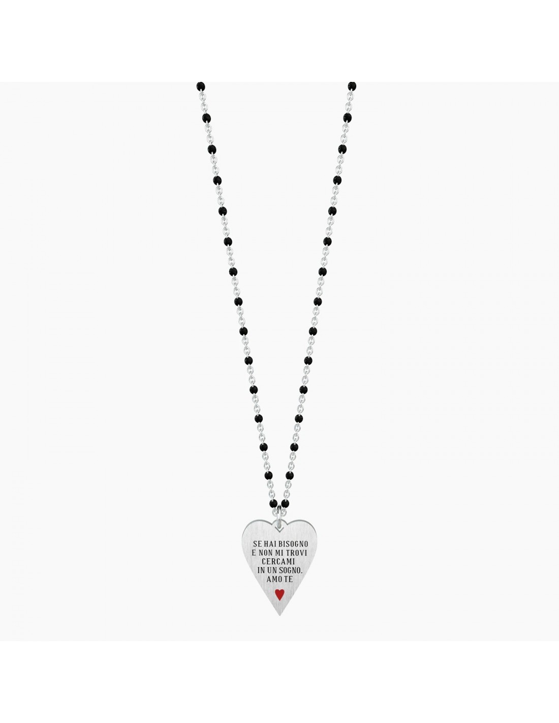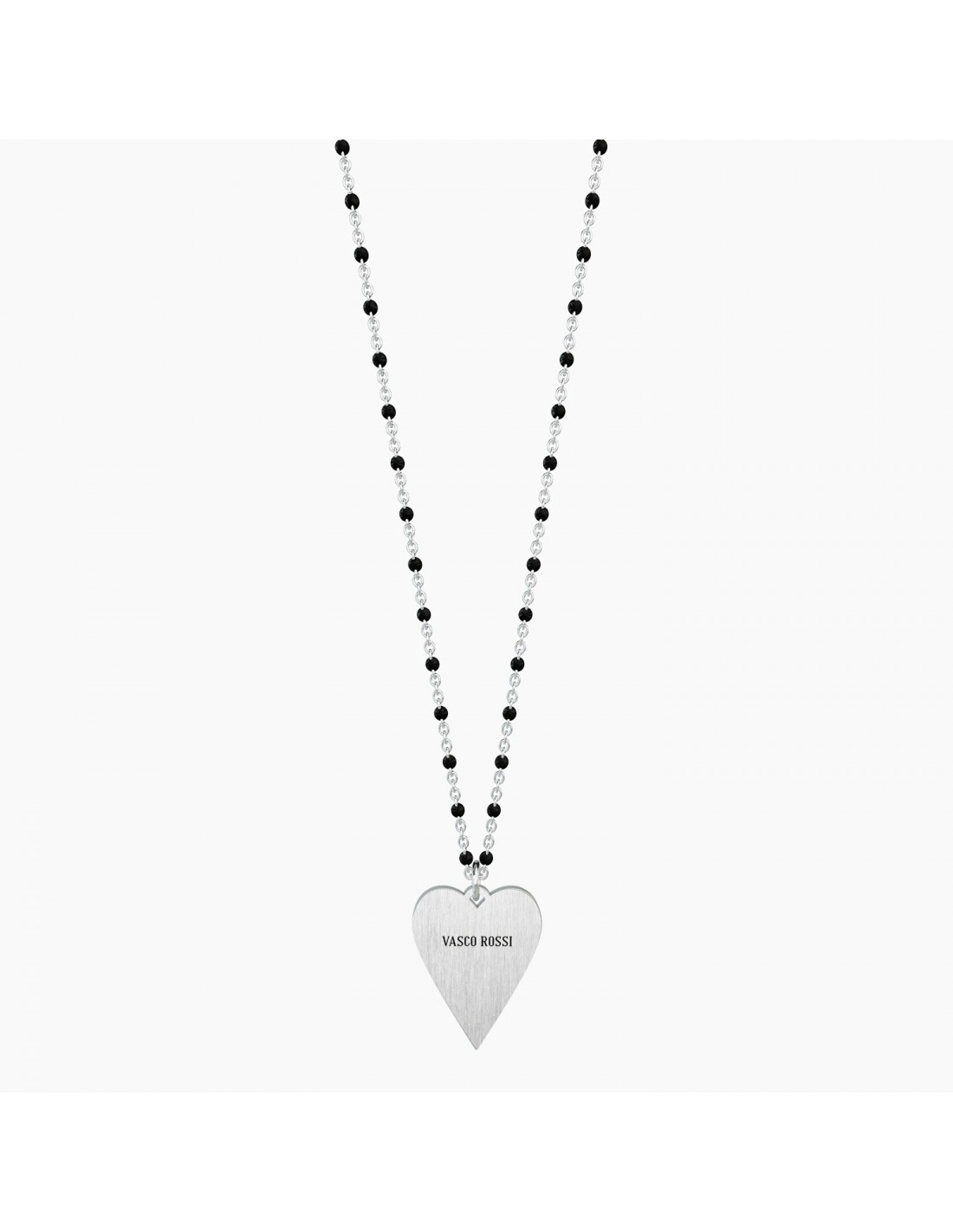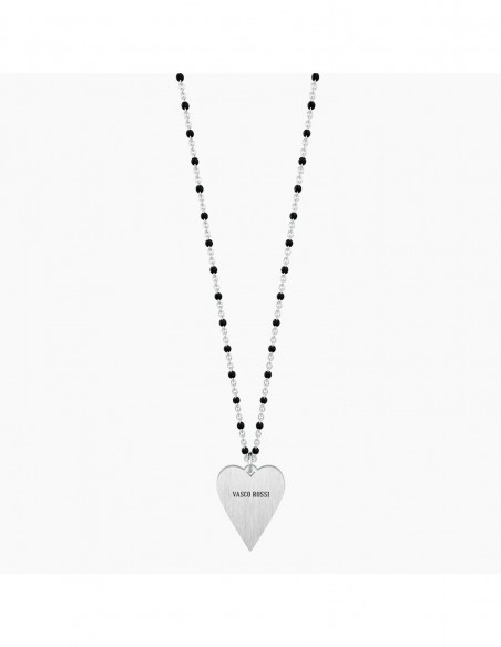 Collana lunga in acciaio con ciondolo satinato a cuore e catena rol con inserimenti in smalto nero.