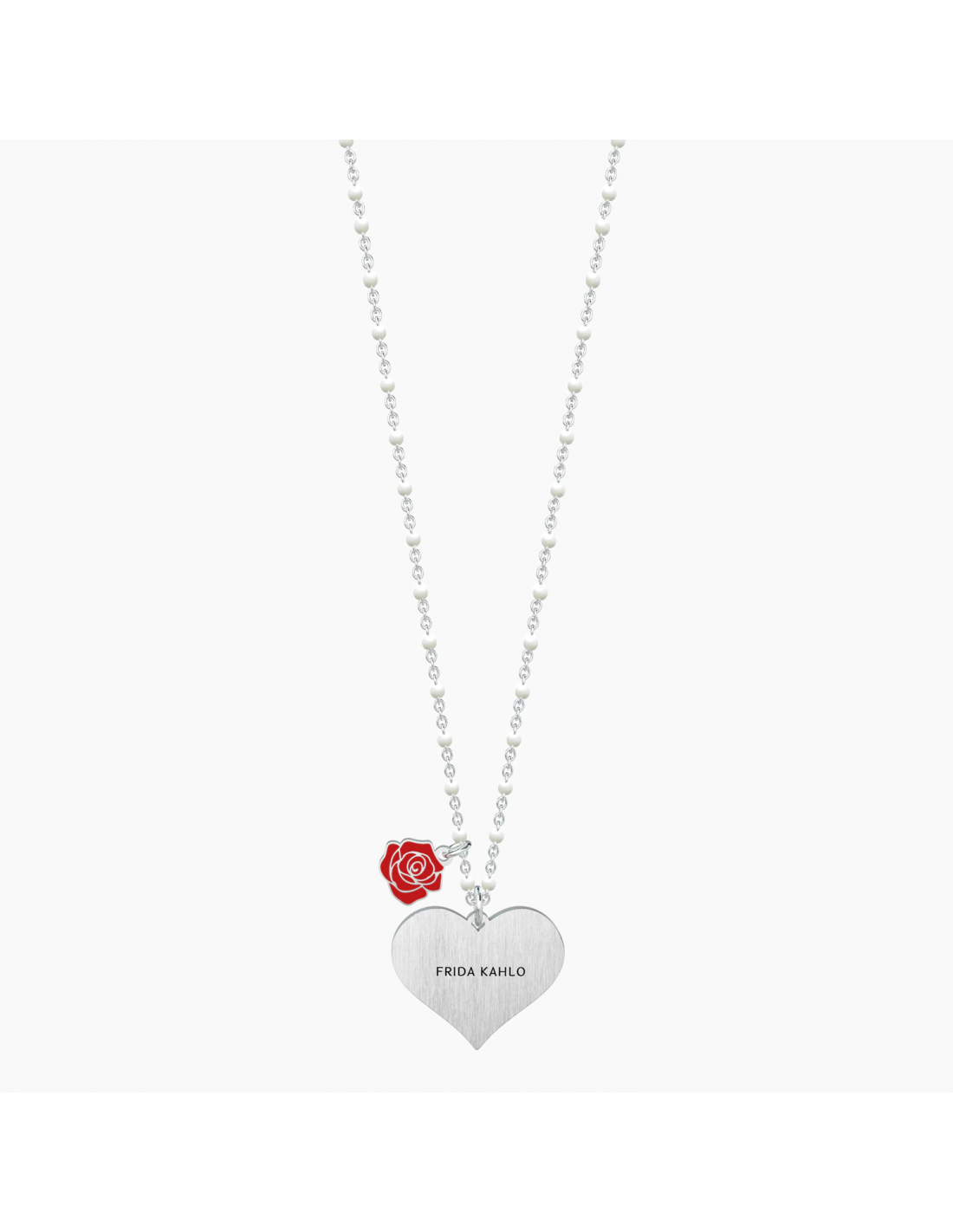 Frida Kahlo Official Collection "Scegli una persona che ti guardi come se fosse una magia." - Frida Kahlo - Collana lunga in acciaio con ciondoli satinato a cuore e a rosa smaltata rossa, catena rol˜ con inserimenti in smalto bianco.