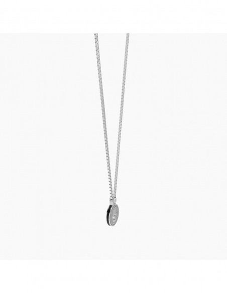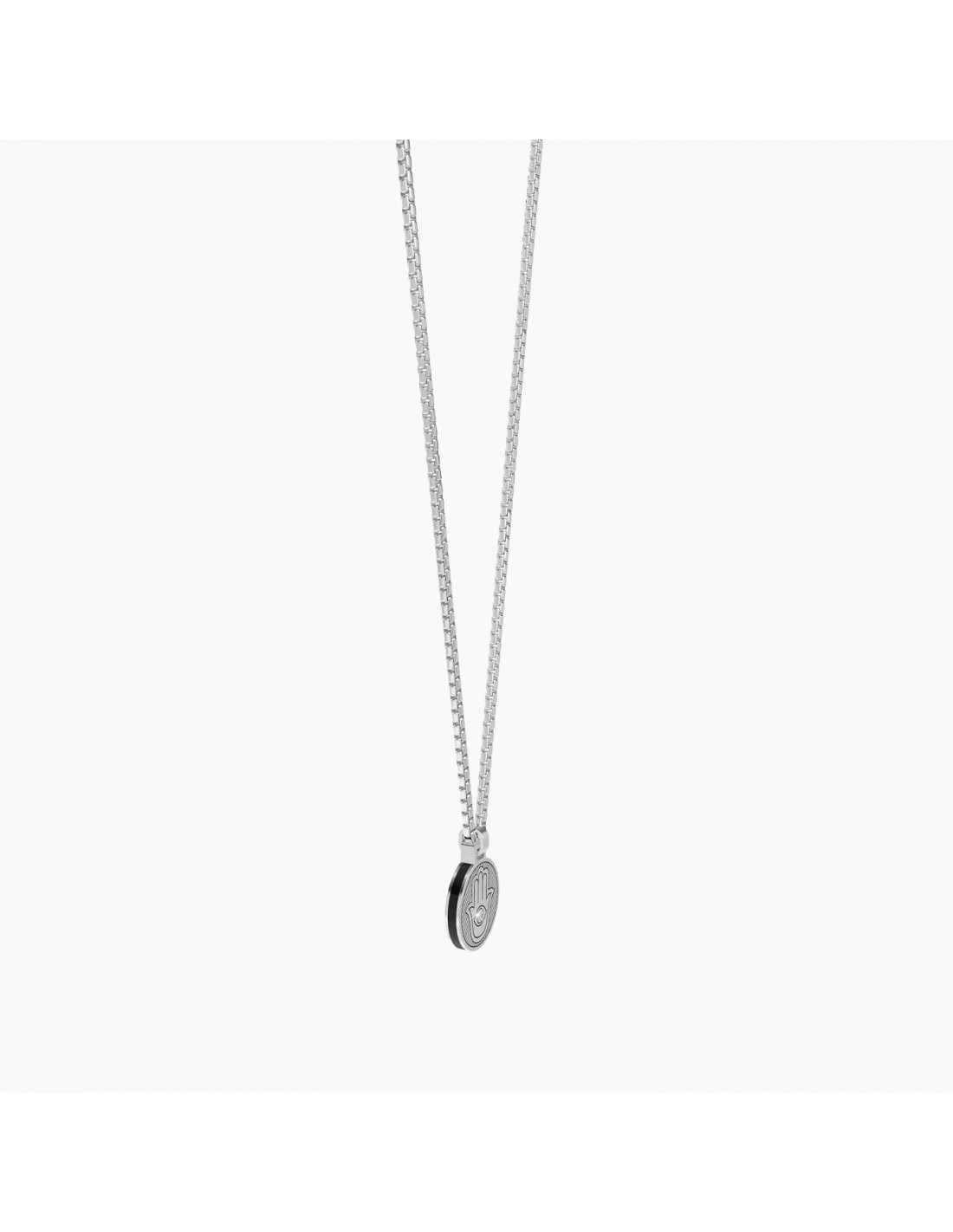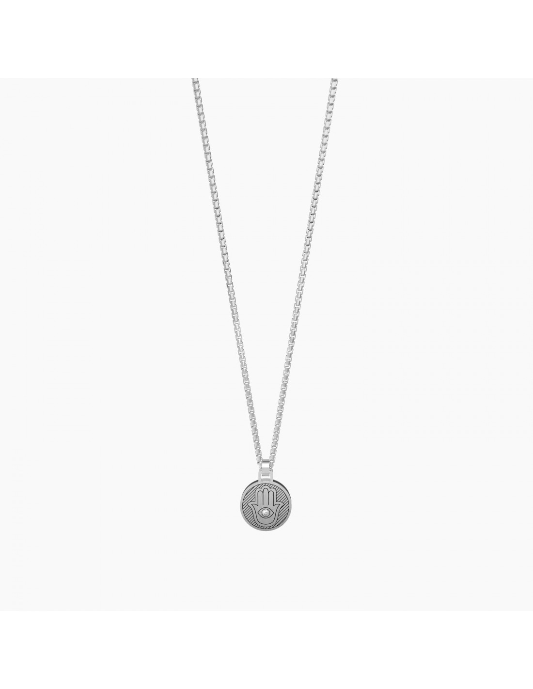 Mano misteriosa che viene da lontano, talismano senza tempo che protegge chi lo indossa da qualsiasi sfortuna. Collana in acciaio con ciondolo tondo satinato Mano di Fatima e catena veneta.