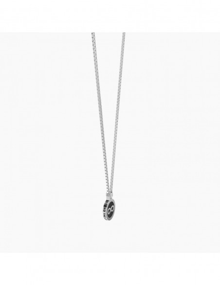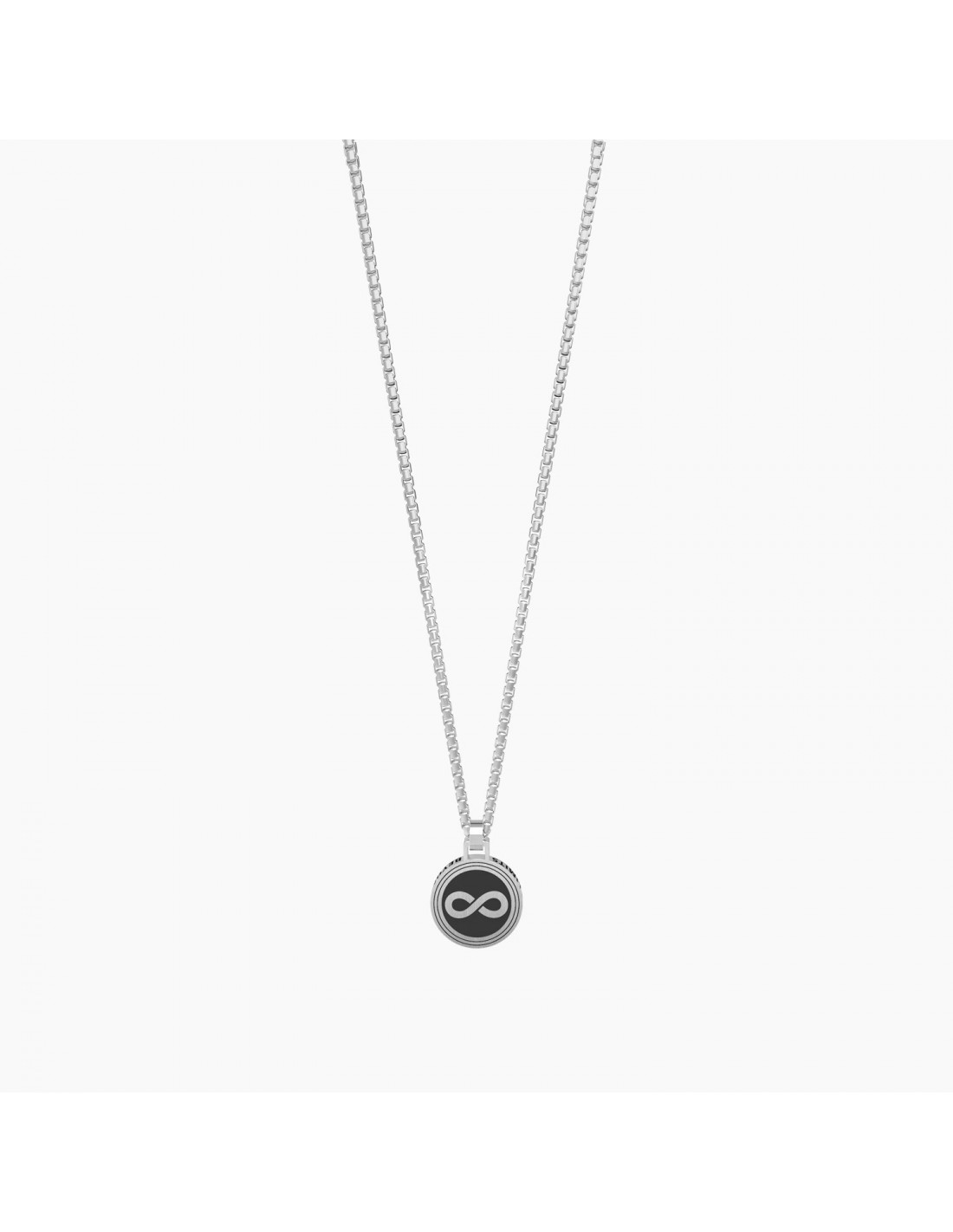 Guardiamo alle stelle e all'infinito universo che ci circonda, spingendoci oltre i nostri limiti, giorno per giorno, alla ricerca della perfezione. Collana in acciaio con ciondolo tondo satinato Infinito di colore nero e catena veneta.