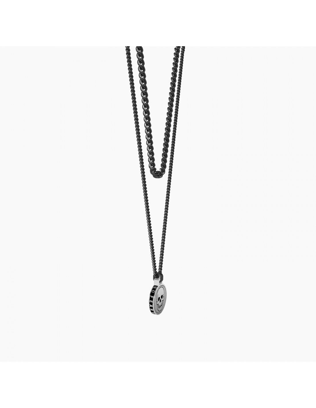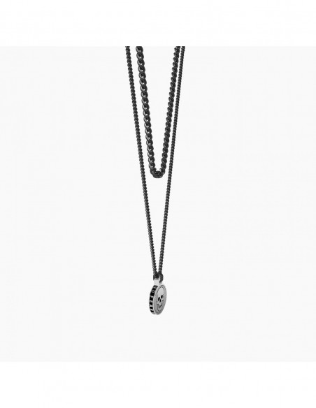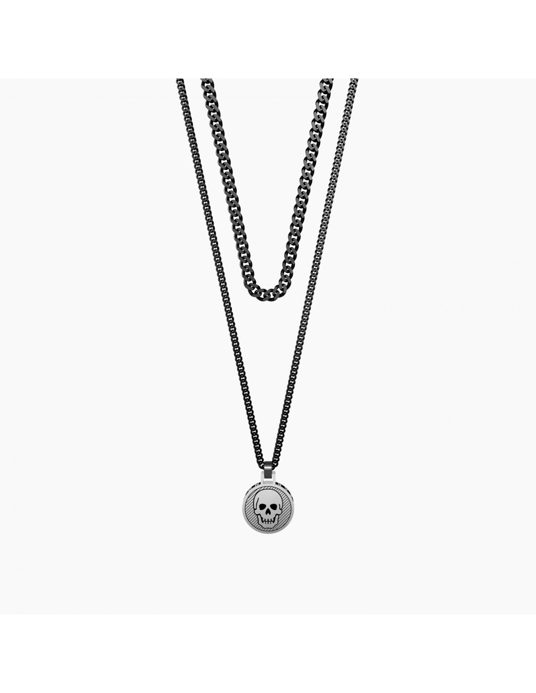 Una vita sul filo del rasoio, senza avere paura di nulla, nemmeno della morte. Libero e forte, segui il tuo istinto e vivi ogni attimo come se fosse l'ultimo. Collana in acciaio a due catene groumette con ciondolo tondo satinato Teschio.