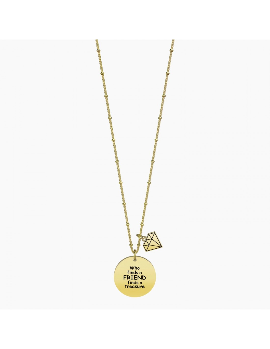 Collana lunga in acciaio color oro con ciondolo tondo e catena groumette con anellini.