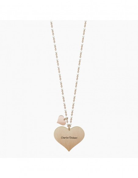 "Tu sei una persona di quelle che si incontrano quando la vita decide di farti un regalo." - Charles Dickens - Collana lunga in acciaio color oro rosa con ciondolo satinato a cuore e catena rol˜ con inserimenti in smalto bianco.