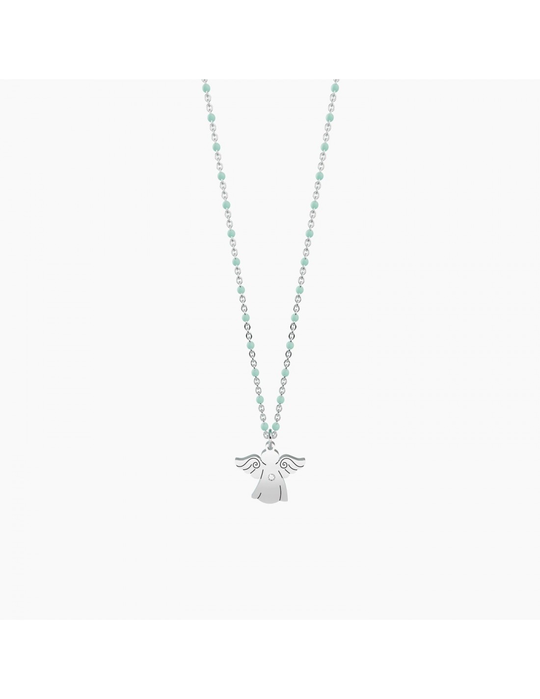 Con Lui al tuo fianco pi sicuro  il sentiero del tuo cammino. Affronta la vita libero di seguire il tuo istinto perchŽ avrai sempre accanto chi ti protegge. Collana corta in acciaio con ciondolo ad angelo e catena rol˜ con inserimenti in smalto verde acqua.