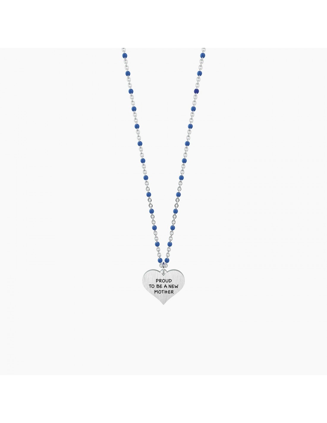 Collana corta in acciaio con ciondolo satinato a cuore e catena rol con inserimenti in smalto blu.