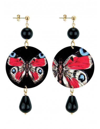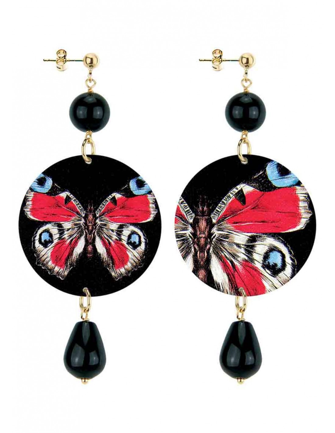 Orecchino farfalla, composto da una capsula piatta stampata. Elementi in ottone galvanizzato oro e pietre naturali. Lunghezza 8 cm.