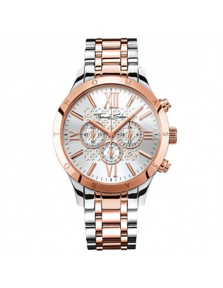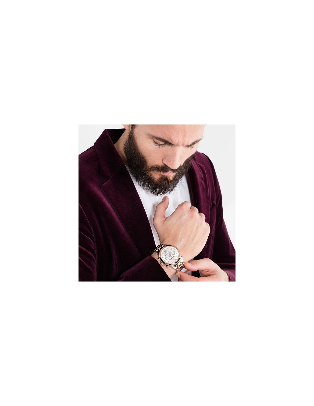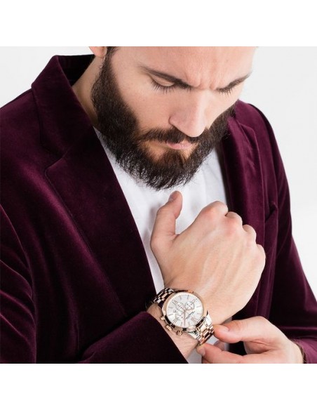 Categoria Orologio da uomo. Materiale Acciaio. Colore oro rosa, argentato. Chiusura deployante in acciaio. Cassa/lunetta acciaio, lunetta in acciaio color oro rosa. Quadrante/lancette quadrante doppio strato sunray argentato con motivo a croci. Vetro minerale temprato antiriflesso con rivestimento in zaffiro. Funzioni ore, minuti, piccoli secondi, contatore delle 24 ore, datario. Funzioni cronografiche secondi cronometrici, contatore dei 60 minuti. Bracciale in acciaio con inserti in acciaio color oro rosa. Impermeabilità 5 ATM. Movimento Quarz/MIYOTA OS2A. Diametro appross. 4,30 cm. Larghezza cinturino appross. 2,00 cm. Altezza cassa appross. 1,20 cm. Codice articoloWA0225-272-201.