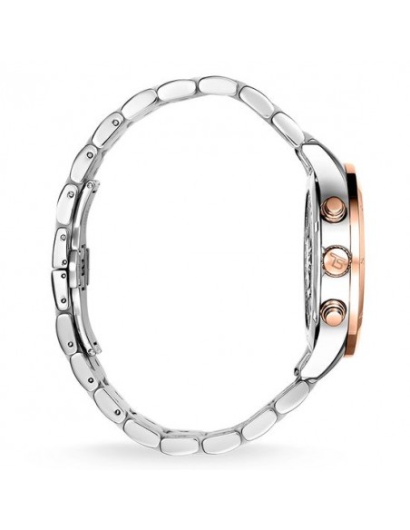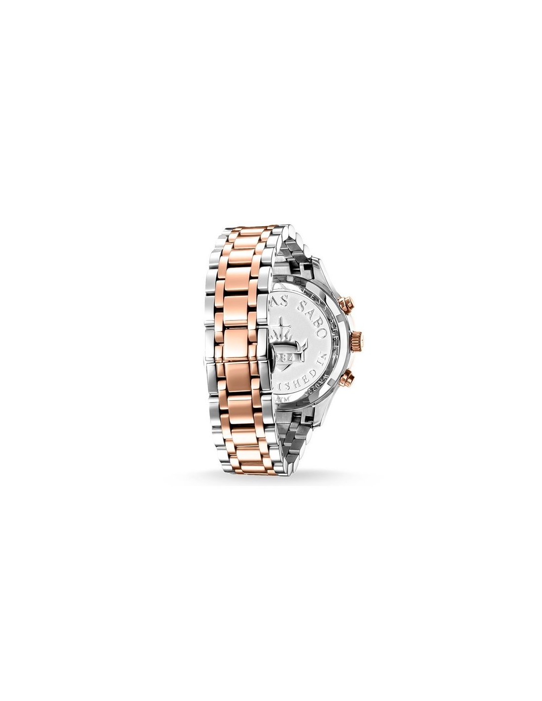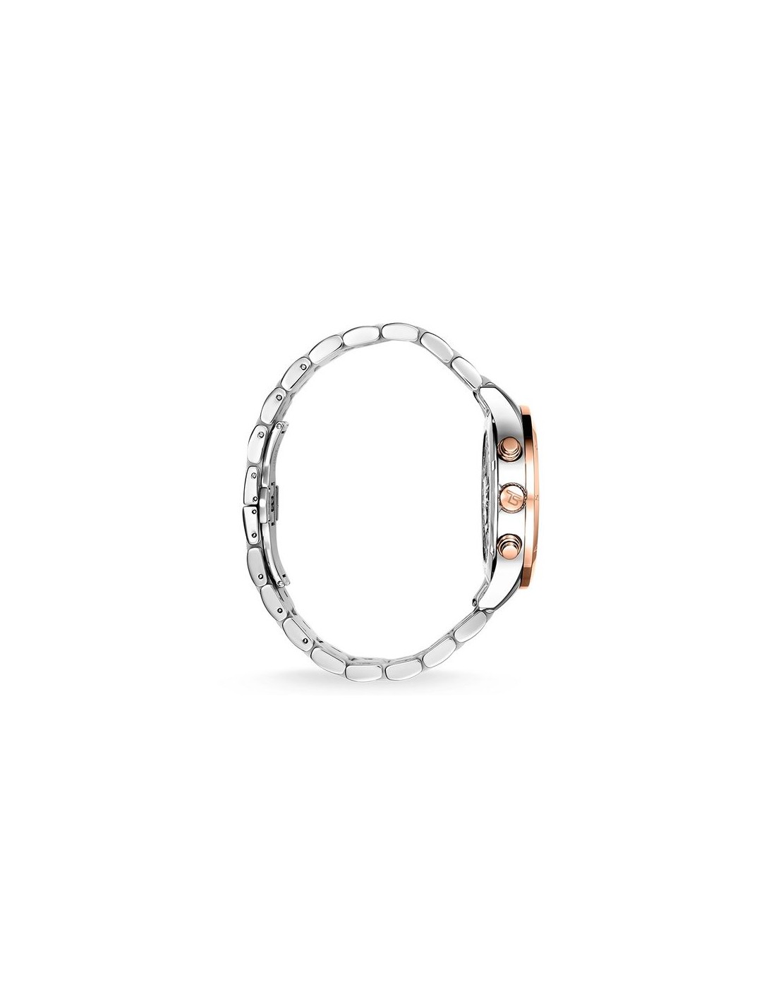 eleganza classica in chiave contemporanea. Il quadrante color argento minuziosamente lavorato è impreziosito dall’elegante finitura sunray e da raffinati dettagli come l’espressivo motivo a croci, che rendono intramontabile il design di questo cronografo. Interpretato nei raffinati toni del rosa e dell’acciaio, l’attualissimo look bicolore conferisce a questo segnatempo un certo je ne sais quoi.