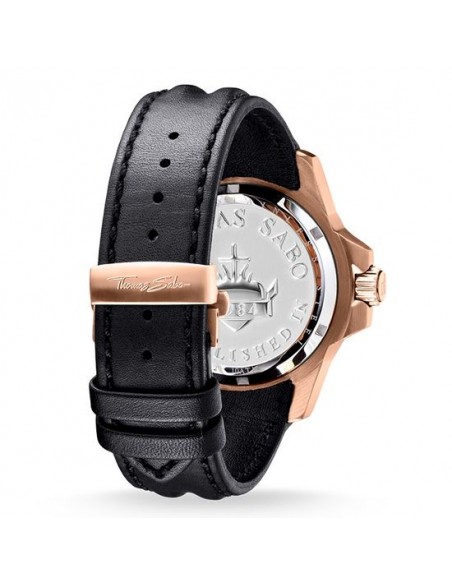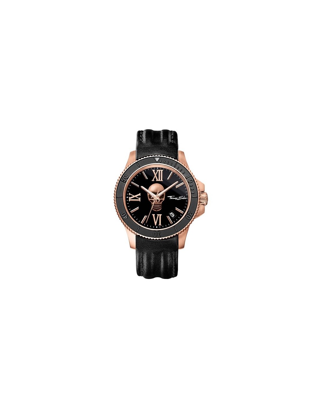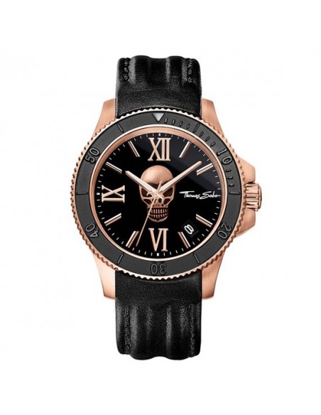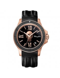 Categoria Orologio da uomo. Materiale Acciaio, Pelle. Colore oro rosa, nero. Chiusura fibbia in acciaio. Cassa/lunetta acciaio color oro rosa, con ghiera girevole. Quadrante/lancette quadrante nero con teschio color oro rosa opaco tridimensionale, lancette luminescenti. Vetro minerale temprato antiriflesso con rivestimento in zaffiro. Funzioni ore, minuti, secondi, datario. Bracciale cinturino di pelle nero opaca. Impermeabilità 10 ATM. Movimento Quarz/MIYOTA 2415. Diametro appross. 4,40 cm. Larghezza cinturino appross. 2,20 cm. Altezza cassa appross. 1,30 cm. Codice articolo WA0279-213-203.