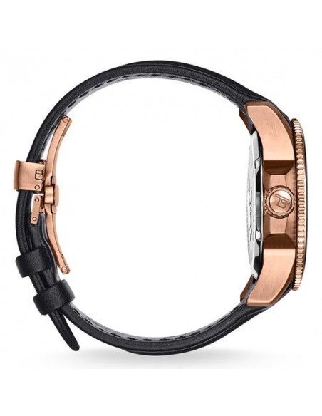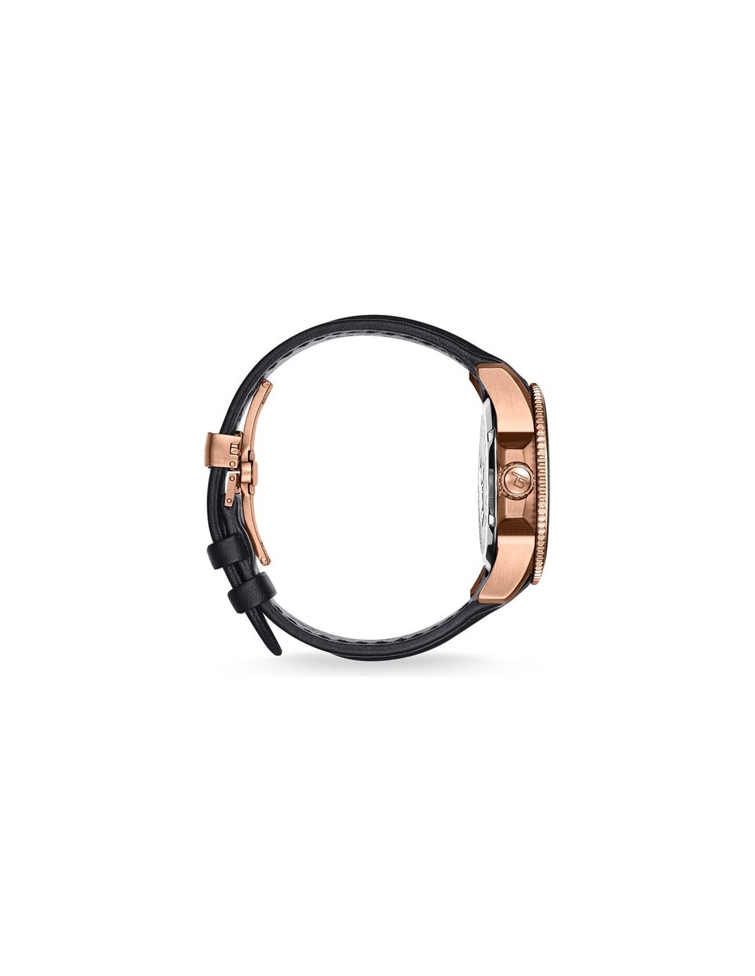 Graffiante look bicolore: nero satinato e oro rosa sono i colori di quest'orologio sportivo a tre lancette, reso unico dal teschio tridimensionale stilizzato che svetta sul quadrante nero e dal contrasto deciso con le lancette luminescenti. Il cinturino racing nero opaco dà il tocco finale all’originale design del modello.