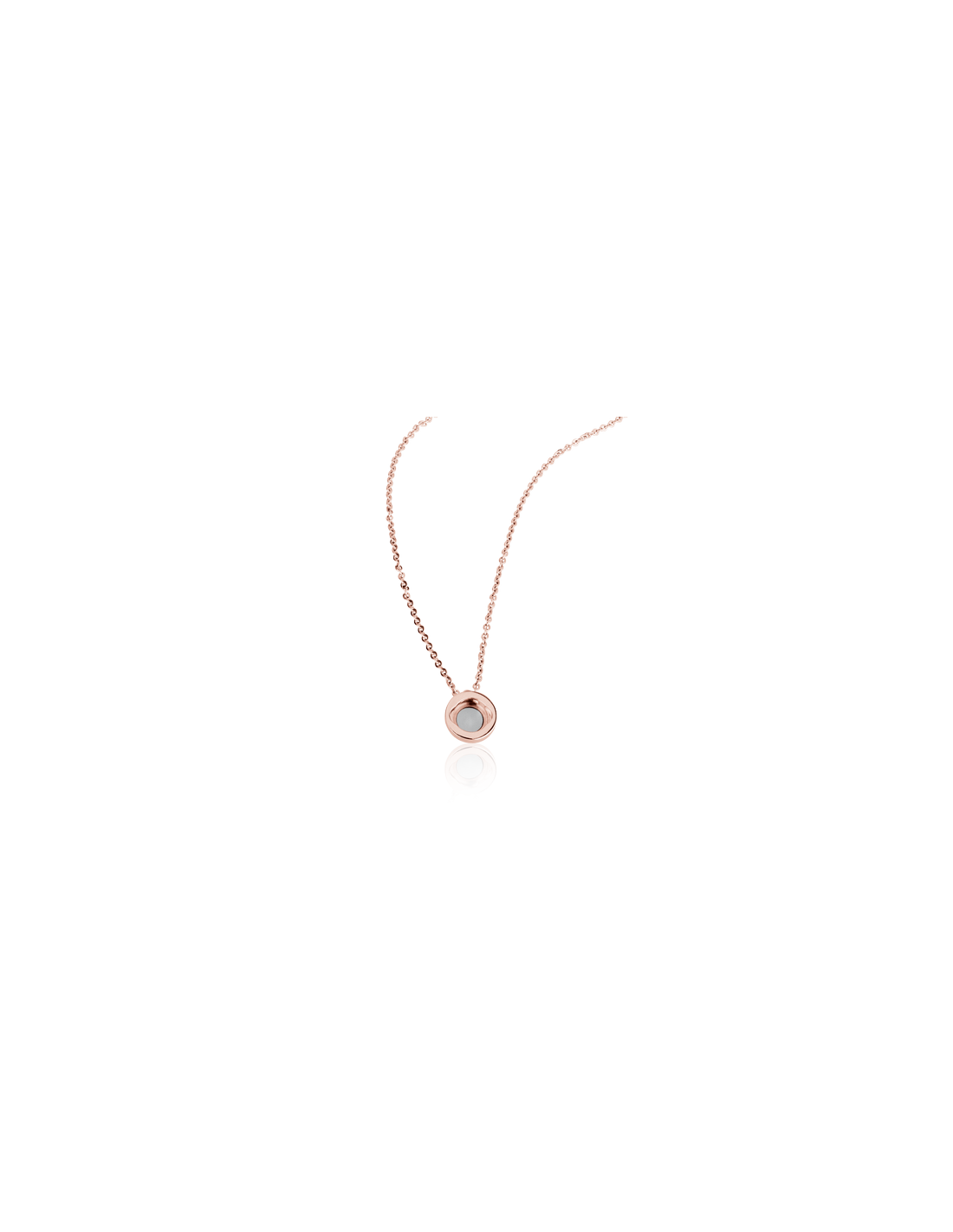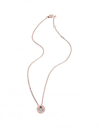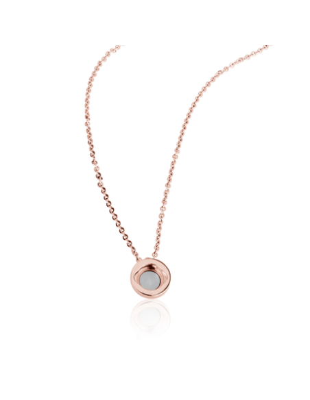 In acciaio lucido con trattamento IP rose. Castone centrale con meccanismo dotato di magnete e aggancio rapido. Catena in acciaio lucido con trattamento IP rose. Lunghezza regolabile: 39-45 cm. Chiusura a moschettone.