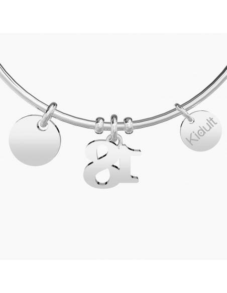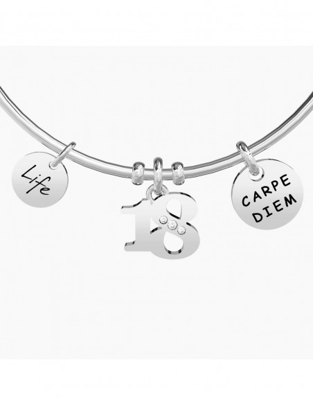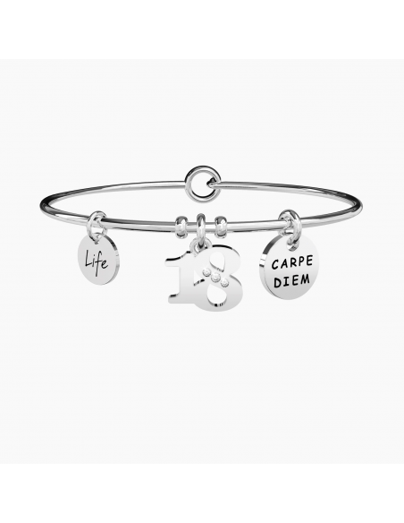 Cogli l'attimo, vivi il presente. Bellezza e spensieratezza, amore e passione, sono questi gli anni pi belli della vita e sono qui, davanti a te. Buon diciottesimo! Bangle in acciaio con ciondoli 18¡ e piastra tonda.
