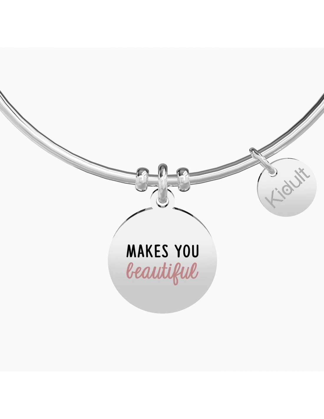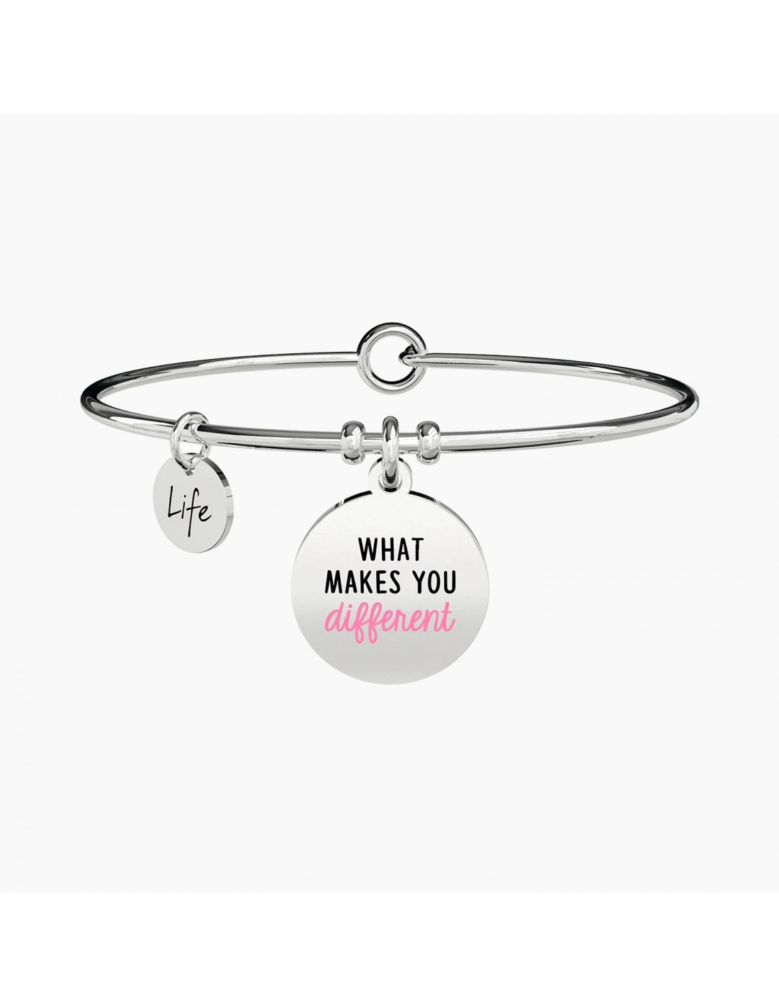 What makes you different makes you beautiful Bangle in acciaio con ciondolo tondo.