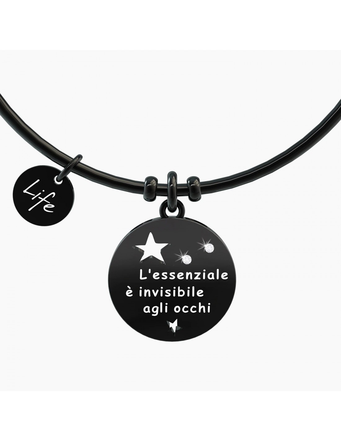 "L'essenziale  invisibile agli occhi" - A. de Saint-ExupŽry - Bangle in acciaio color nero con ciondolo tondo.