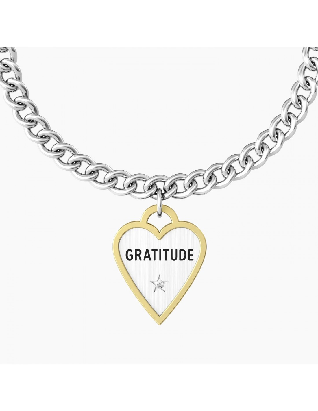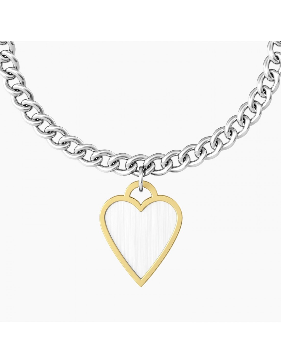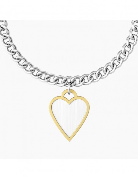 Bracciale in acciaio con catena groumette "comfort fit" e ciondolo satinato a cuore con rifinitura color oro giallo e cristallo.