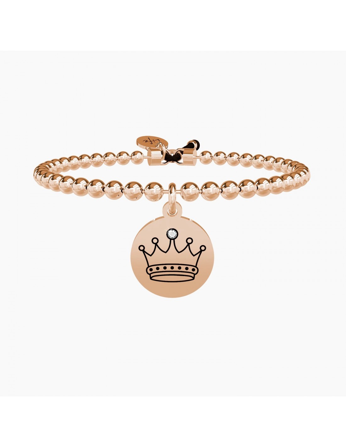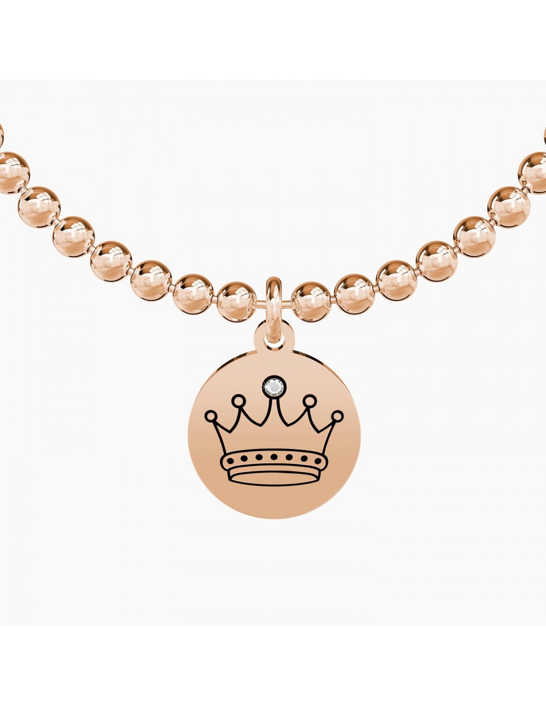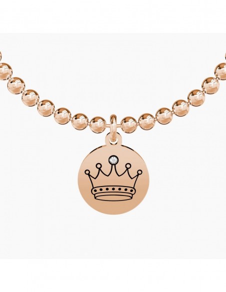 Forte, intelligente e coraggiosa. Sei nata per essere regina, per guidare chi ti sta accanto nelle avventure della vita. Bangle con filo armonico, sfere in acciaio color oro rosa e ciondolo tondo.